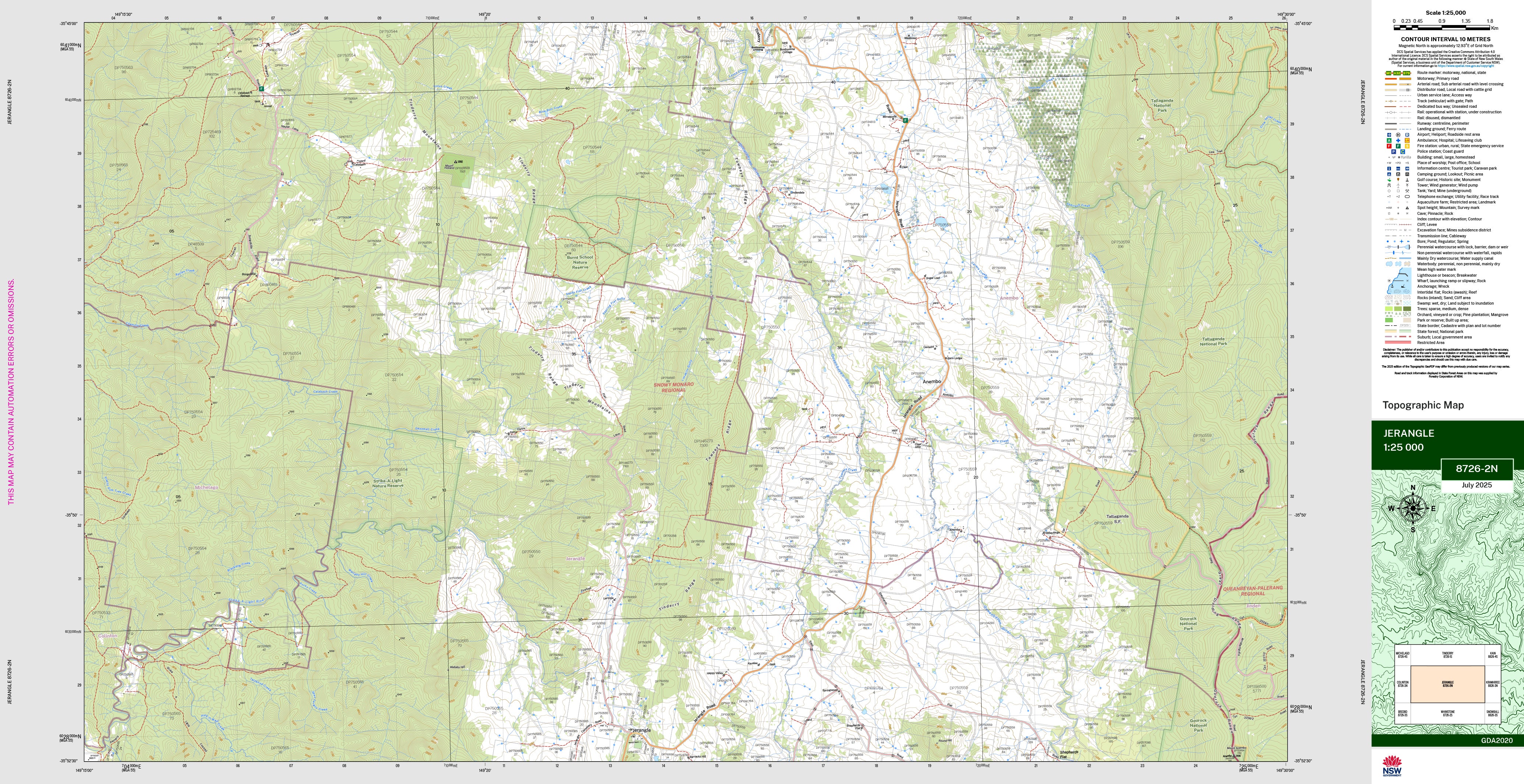 The Jerangle 1:25,000 scale New South Wales topographic map shows contours, streams, roads, tracks, buildings, place names, points of interest, vegetation, selected administrative boundaries and much more.