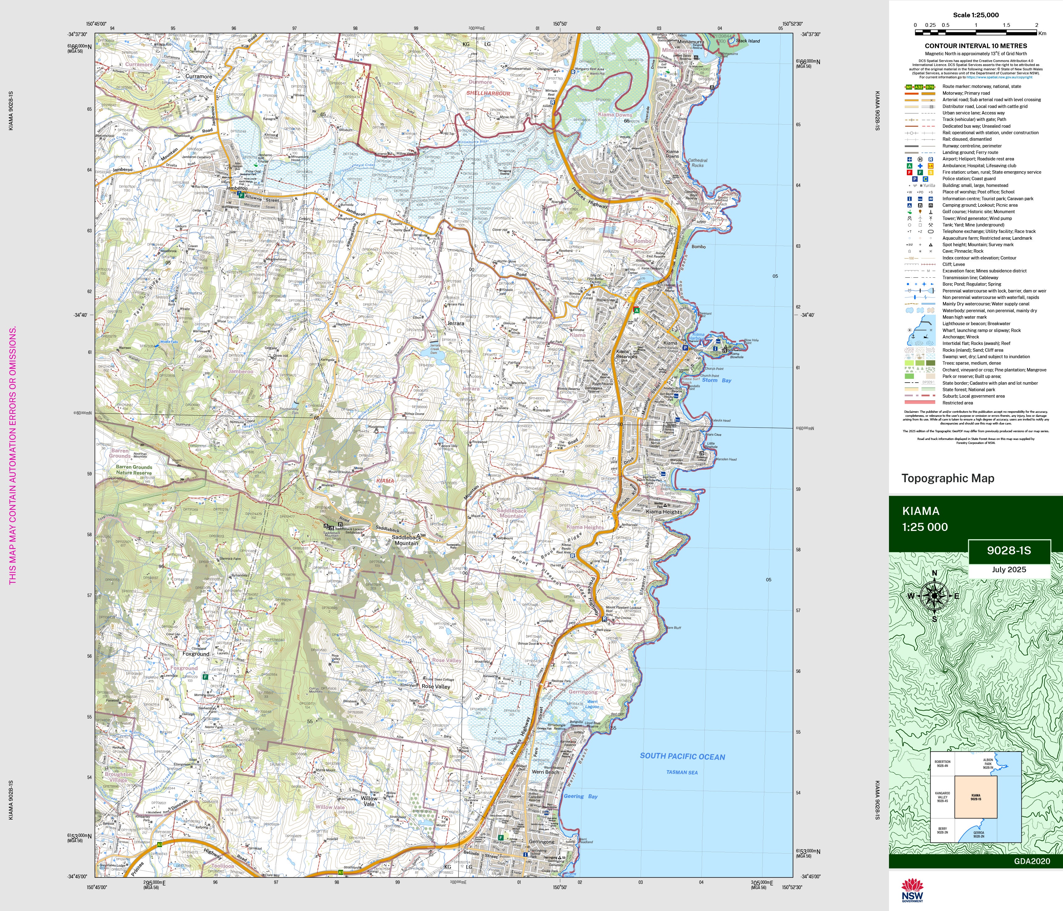 The Kiama 1:25,000 scale New South Wales topographic map shows contours, streams, roads, tracks, buildings, place names, points of interest, vegetation, selected administrative boundaries and much more.