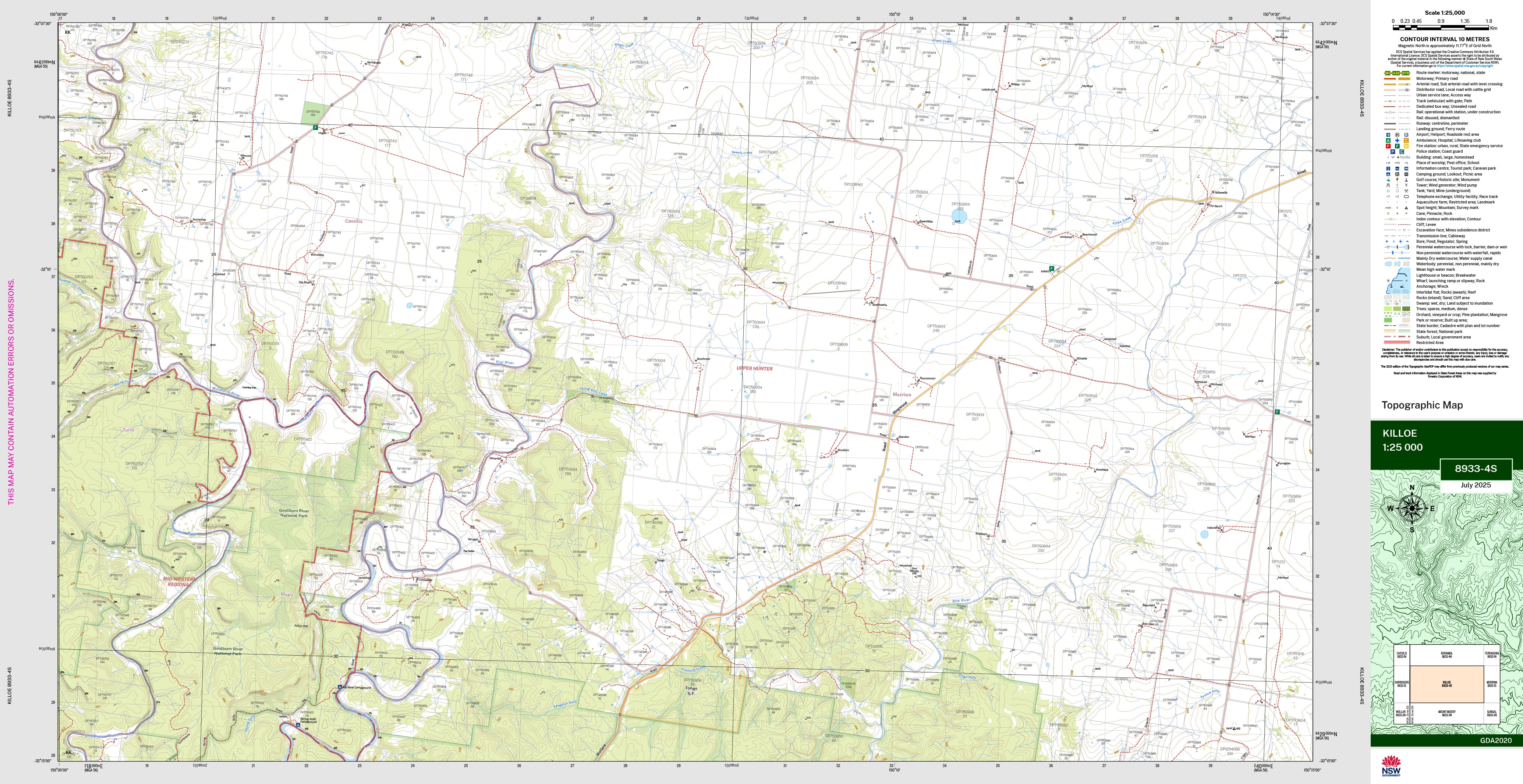 The Killoe 1:25,000 scale New South Wales topographic map shows contours, streams, roads, tracks, buildings, place names, points of interest, vegetation, selected administrative boundaries and much more.