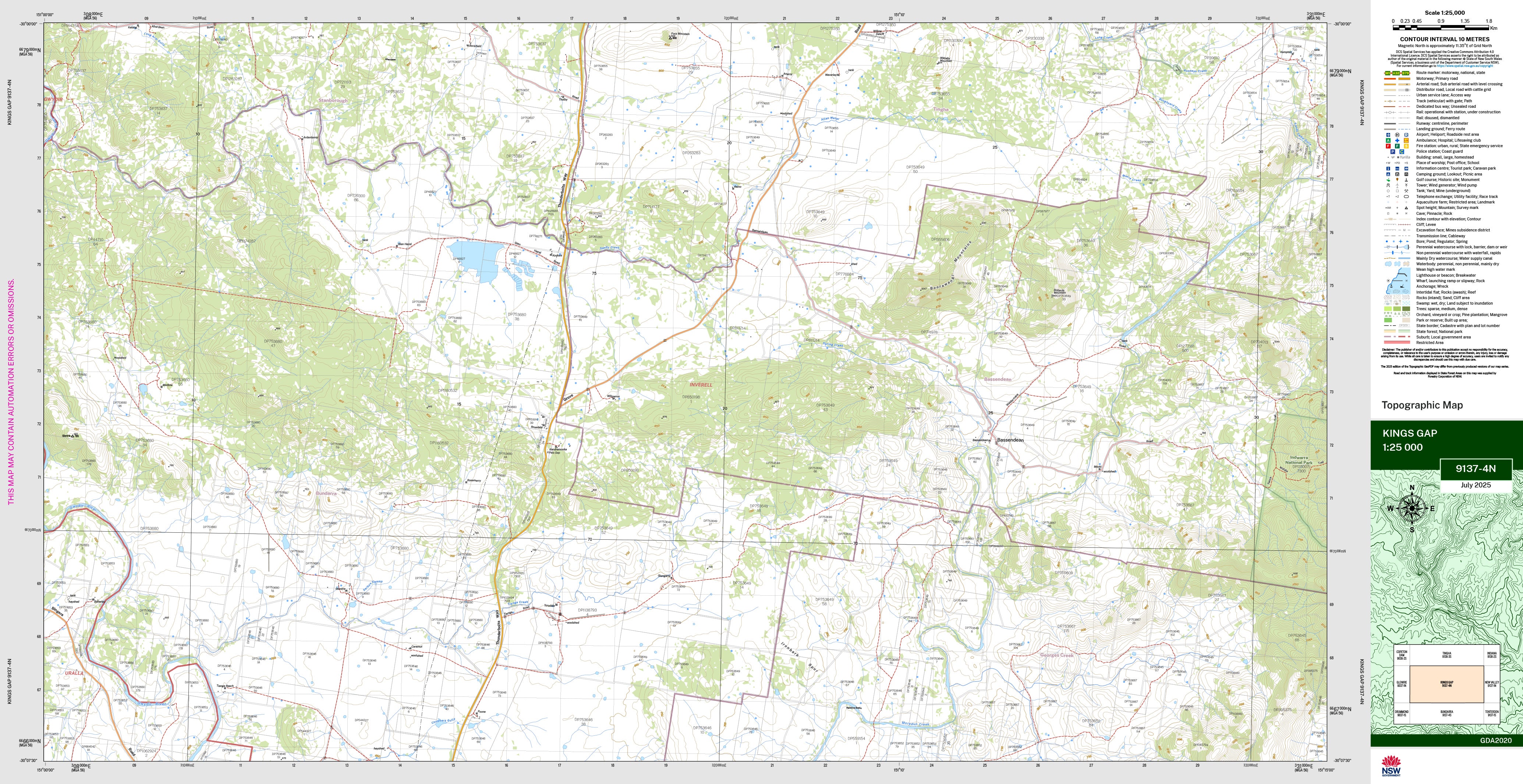The Kings Gap 1:25,000 scale New South Wales topographic map shows contours, streams, roads, tracks, buildings, place names, points of interest, vegetation, selected administrative boundaries and much more.