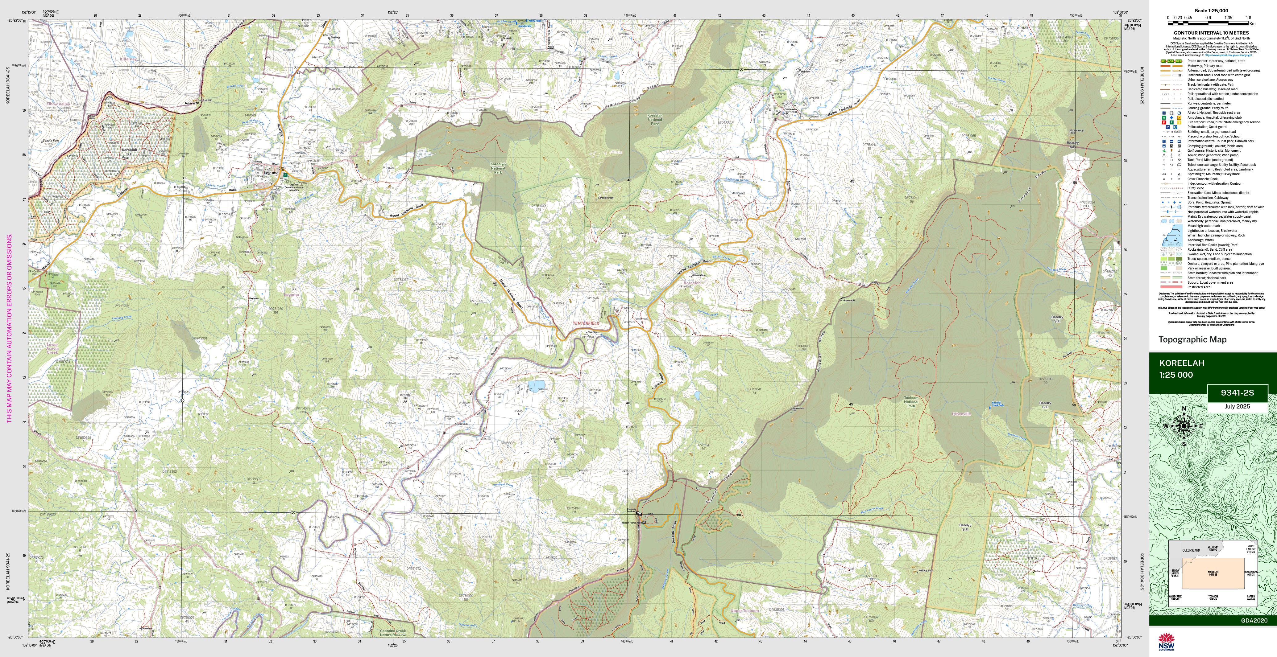The Koreelah 1:25,000 scale New South Wales topographic map shows contours, streams, roads, tracks, buildings, place names, points of interest, vegetation, selected administrative boundaries and much more.