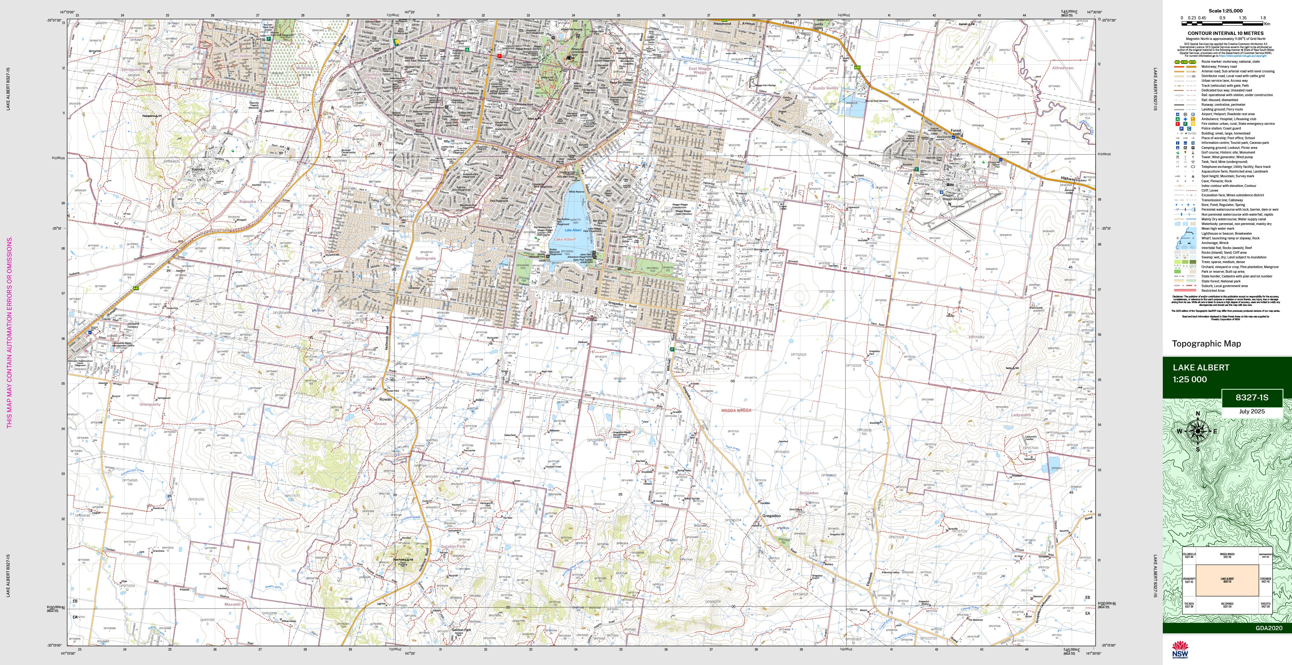 The Lake Albert 1:25,000 scale New South Wales topographic map shows contours, streams, roads, tracks, buildings, place names, points of interest, vegetation, selected administrative boundaries and much more.