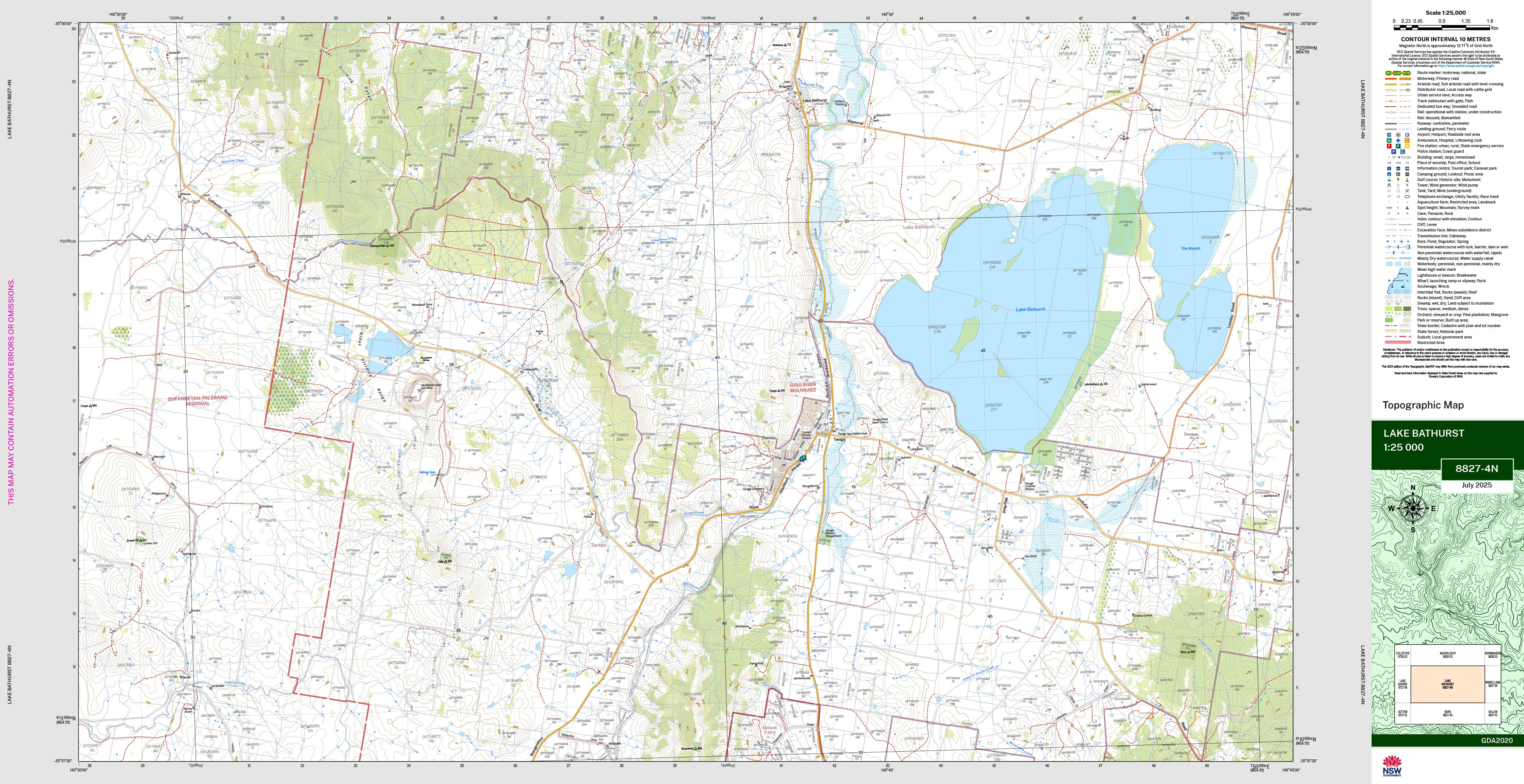 The Lake Bathurst 1:25,000 scale New South Wales topographic map shows contours, streams, roads, tracks, buildings, place names, points of interest, vegetation, selected administrative boundaries and much more.