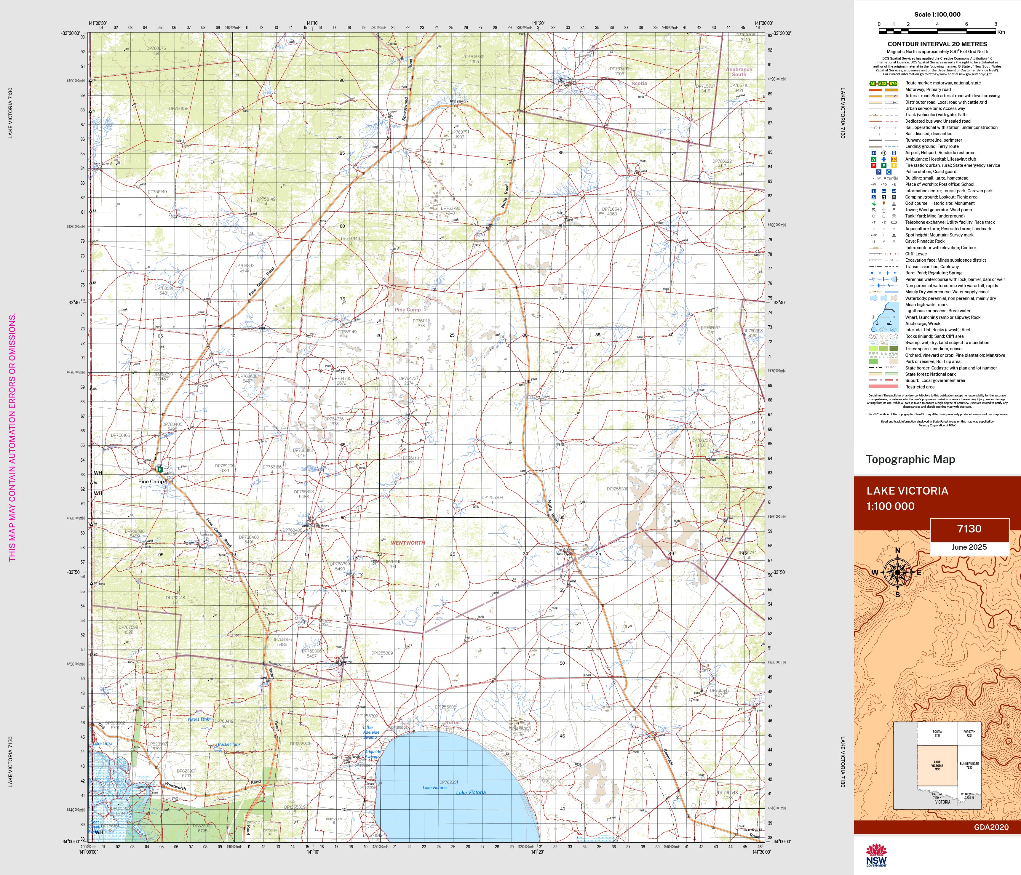 The Lake Victoria 1:100,000 scale New South Wales topographic map shows contours, streams, roads, tracks, buildings, place names, points of interest, vegetation, selected administrative boundaries and much more.