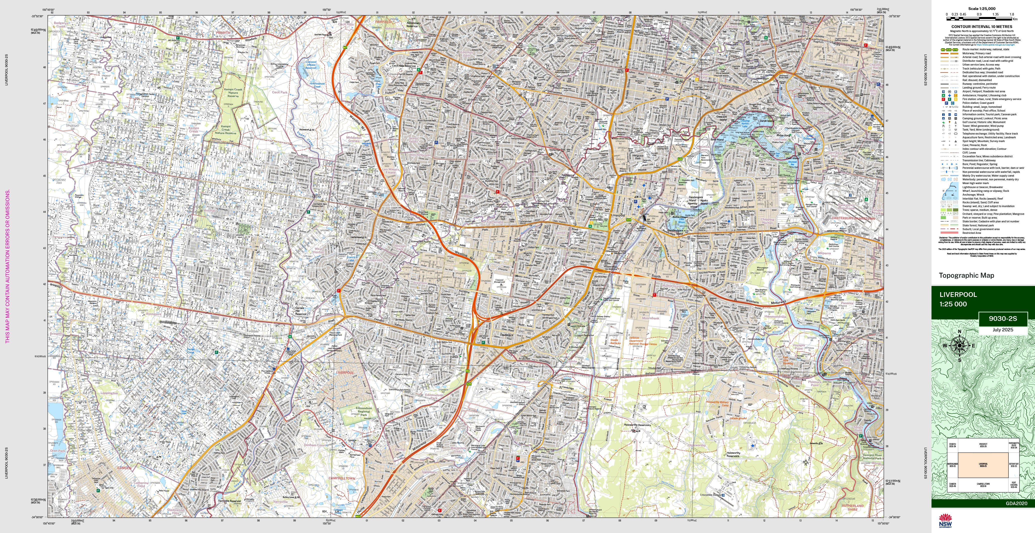 The Liverpool 1:25,000 scale New South Wales topographic map shows contours, streams, roads, tracks, buildings, place names, points of interest, vegetation, selected administrative boundaries and much more.