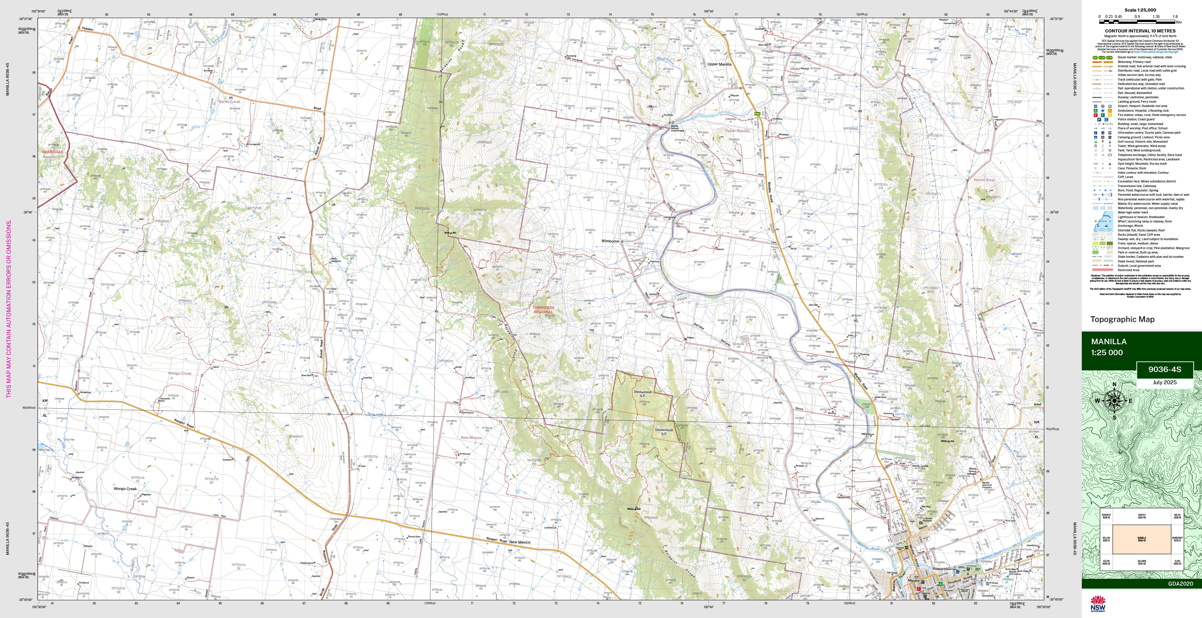 The Manilla 1:25,000 scale New South Wales topographic map shows contours, streams, roads, tracks, buildings, place names, points of interest, vegetation, selected administrative boundaries and much more.