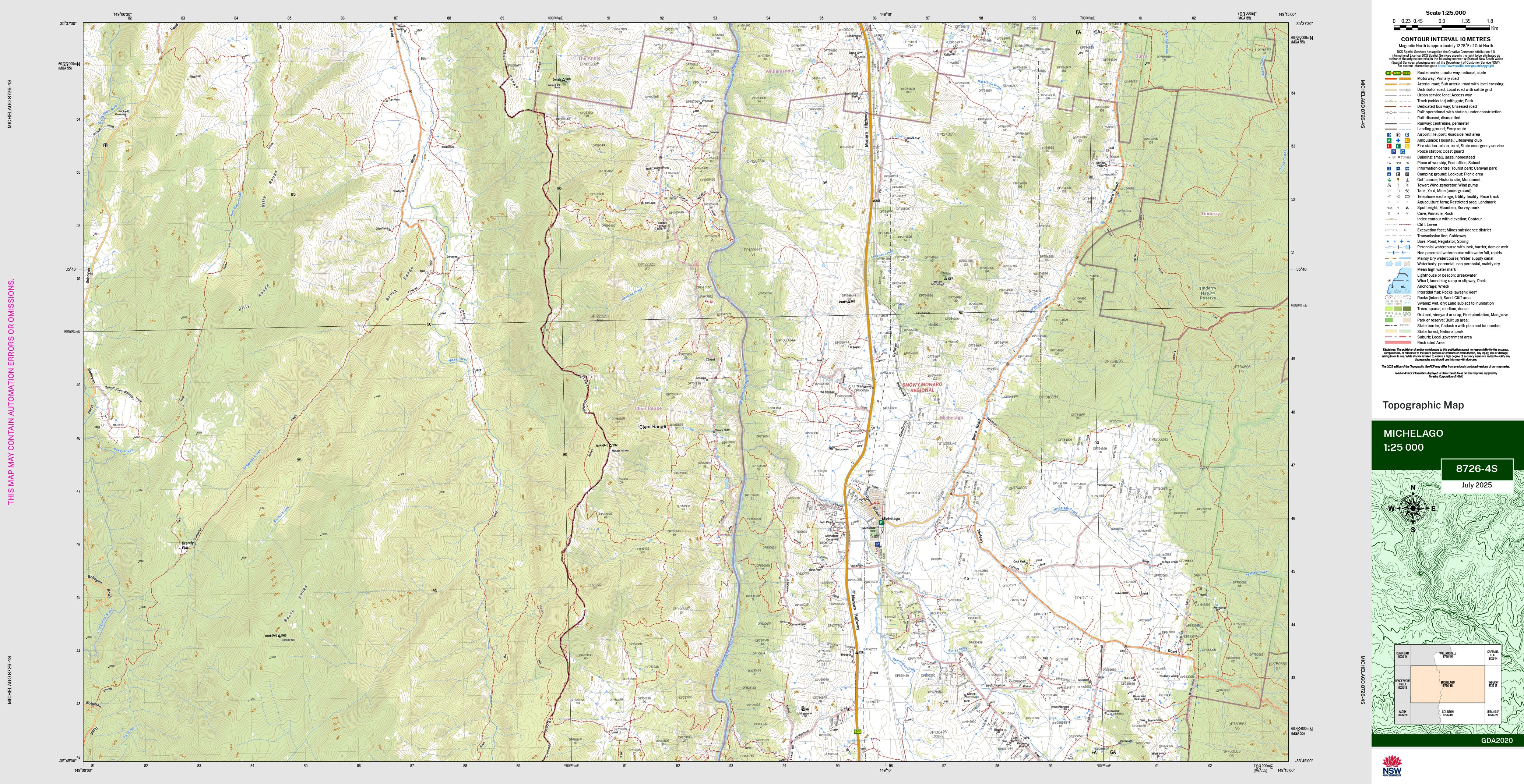The Michelago 1:25,000 scale New South Wales topographic map shows contours, streams, roads, tracks, buildings, place names, points of interest, vegetation, selected administrative boundaries and much more.