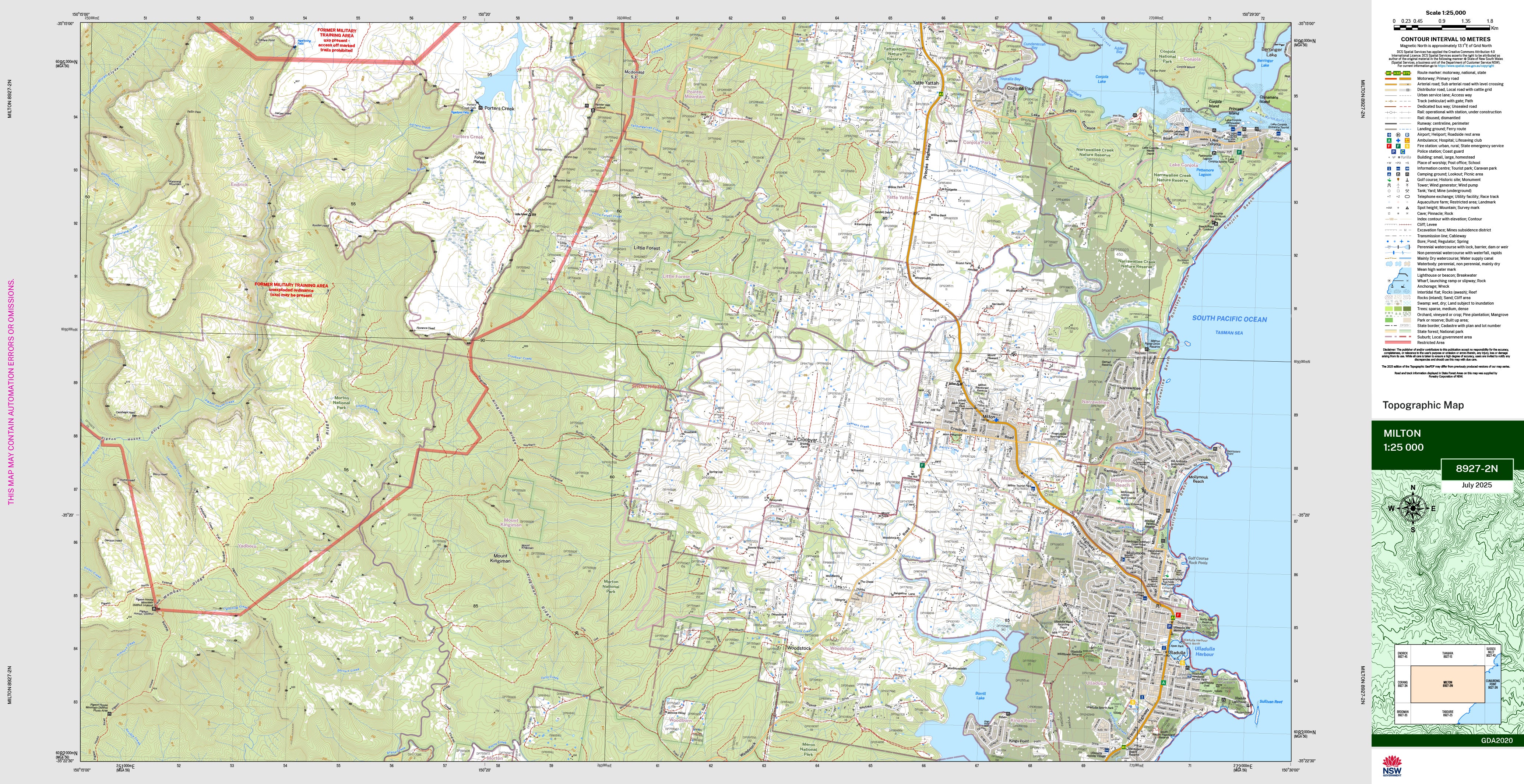 The Milton 1:25,000 scale New South Wales topographic map shows contours, streams, roads, tracks, buildings, place names, points of interest, vegetation, selected administrative boundaries and much more.