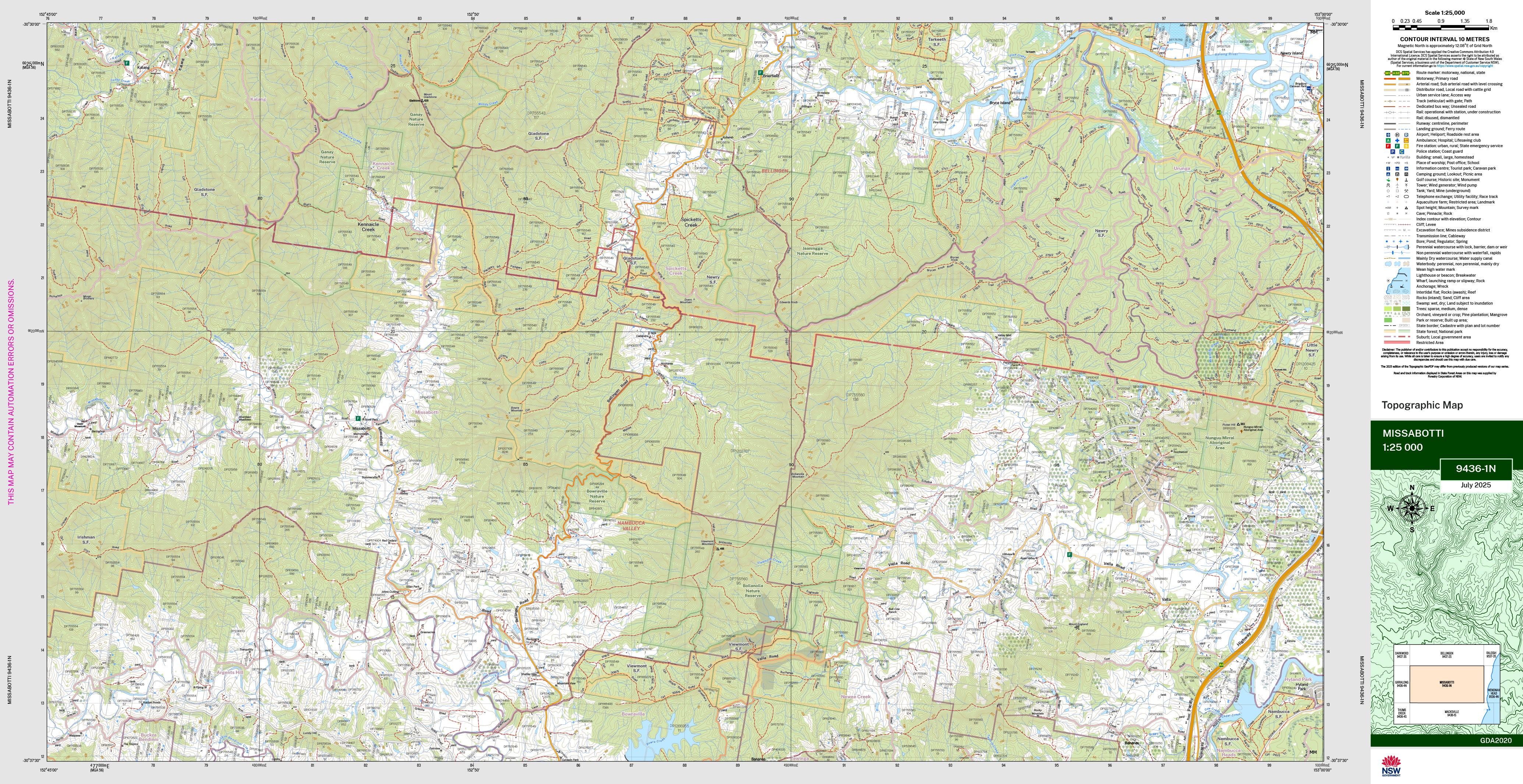 The Missabotti 1:25,000 scale New South Wales topographic map shows contours, streams, roads, tracks, buildings, place names, points of interest, vegetation, selected administrative boundaries and much more.