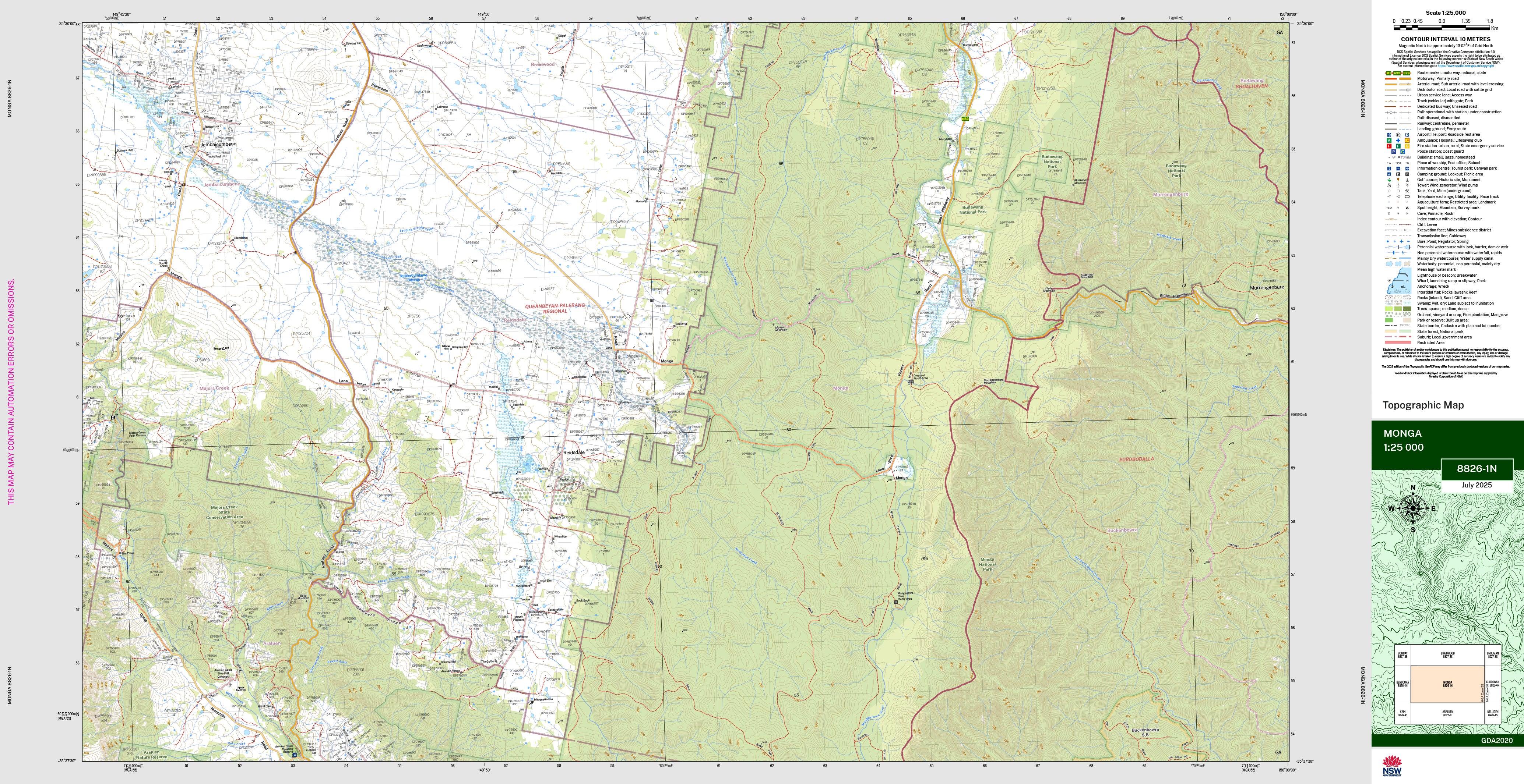 The Monga 1:25,000 scale New South Wales topographic map shows contours, streams, roads, tracks, buildings, place names, points of interest, vegetation, selected administrative boundaries and much more.