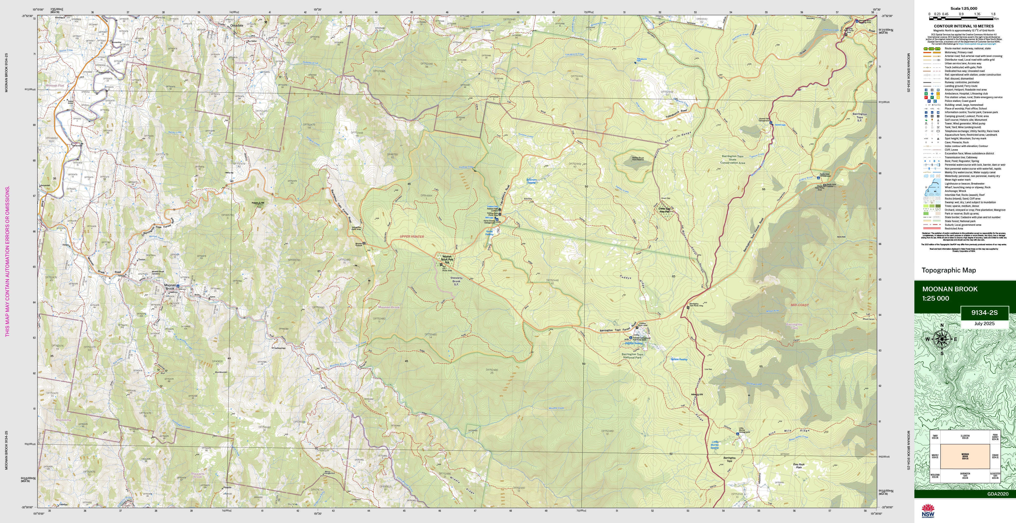 The Moonan Brook 1:25,000 scale New South Wales topographic map shows contours, streams, roads, tracks, buildings, place names, points of interest, vegetation, selected administrative boundaries and much more.