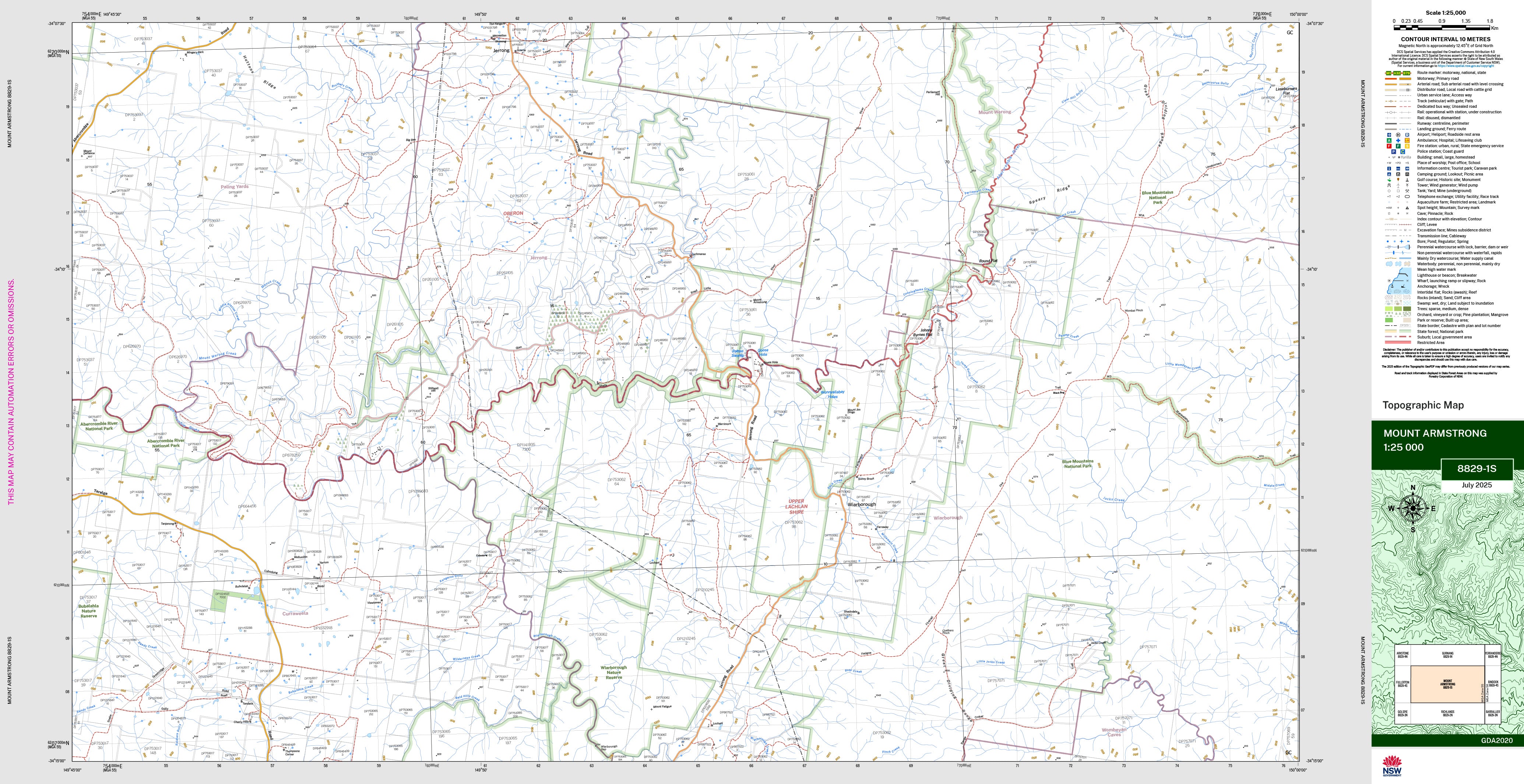 The Mount Armstrong 1:25,000 scale New South Wales topographic map shows contours, streams, roads, tracks, buildings, place names, points of interest, vegetation, selected administrative boundaries and much more.