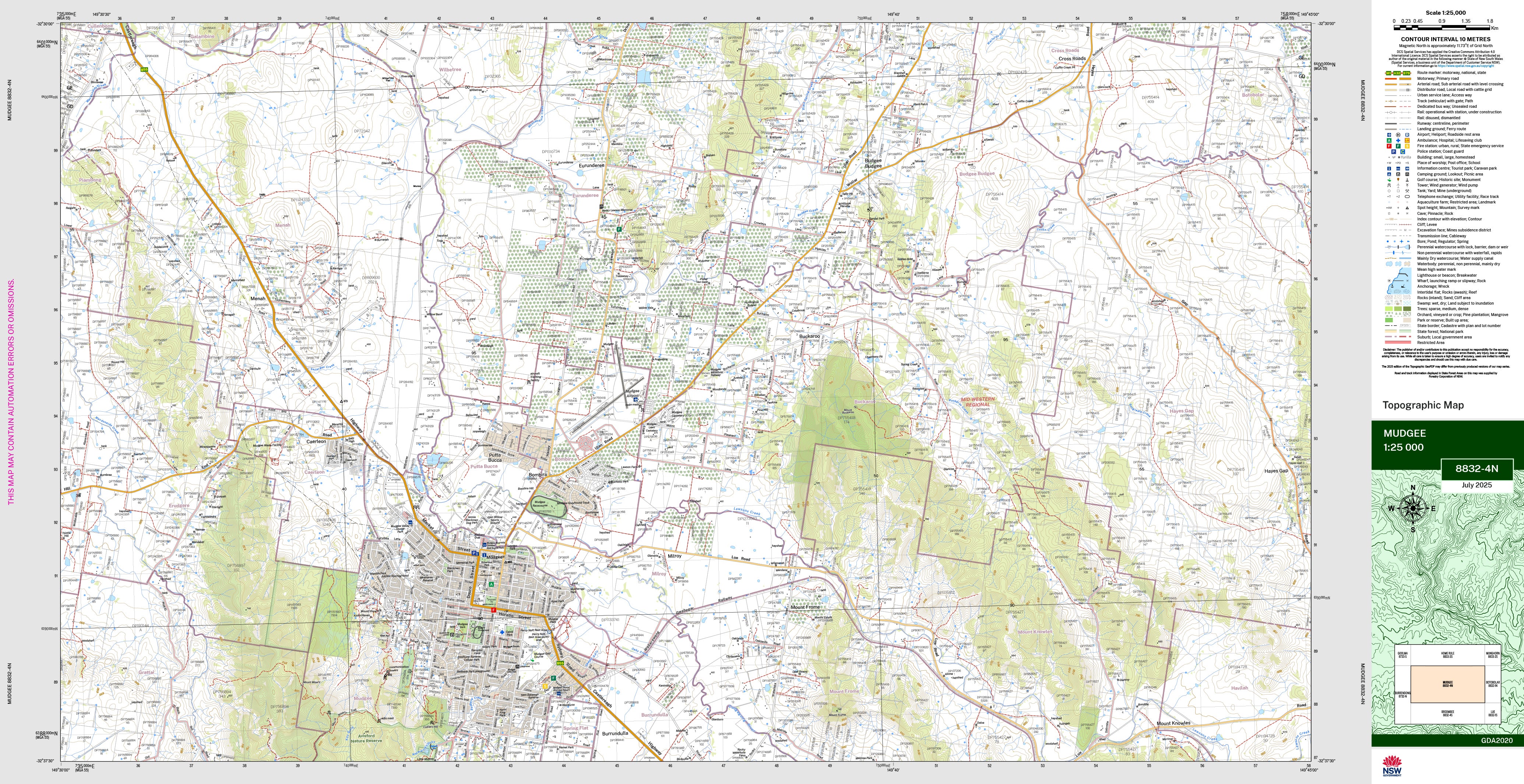 The Mudgee 1:25,000 scale New South Wales topographic map shows contours, streams, roads, tracks, buildings, place names, points of interest, vegetation, selected administrative boundaries and much more.