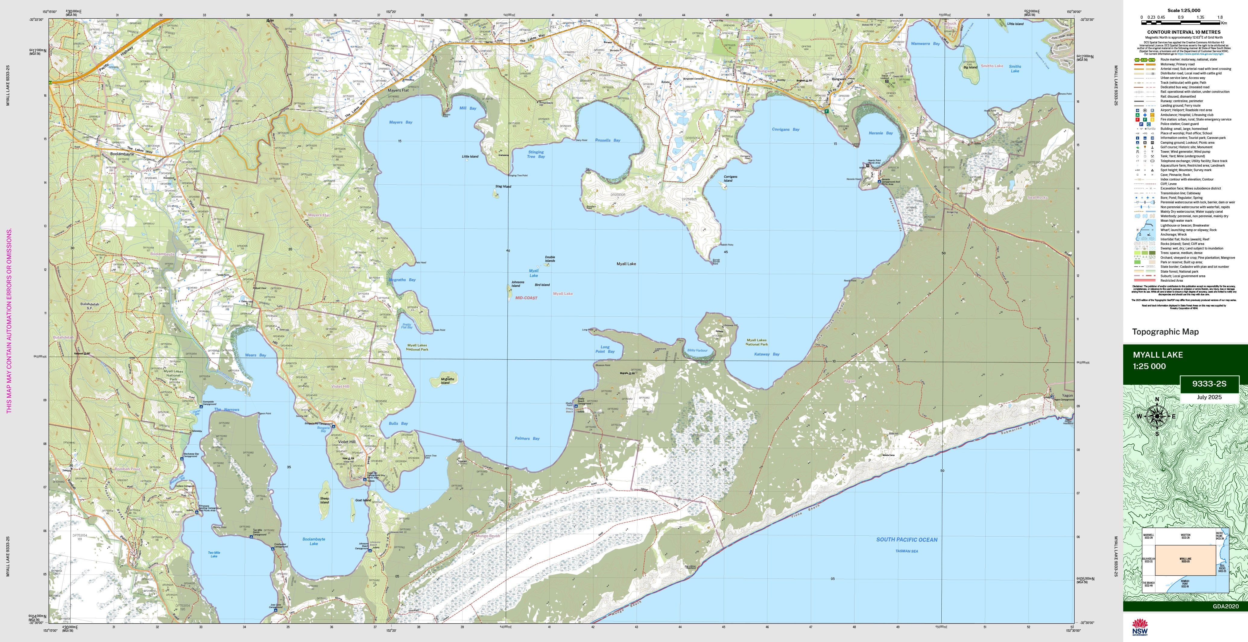 The Myall Lake 1:25,000 scale New South Wales topographic map shows contours, streams, roads, tracks, buildings, place names, points of interest, vegetation, selected administrative boundaries and much more.