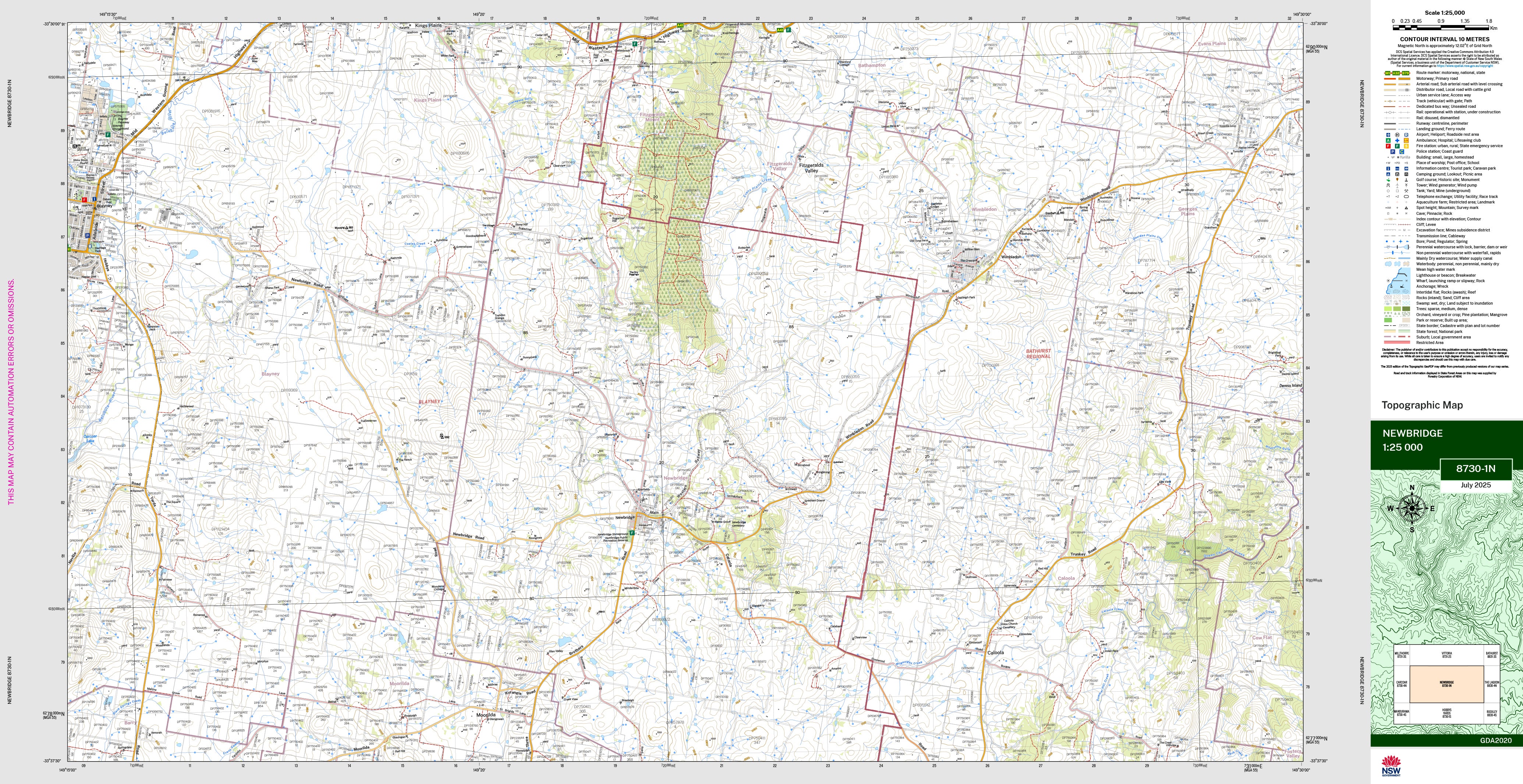 The Newbridge 1:25,000 scale New South Wales topographic map shows contours, streams, roads, tracks, buildings, place names, points of interest, vegetation, selected administrative boundaries and much more.
