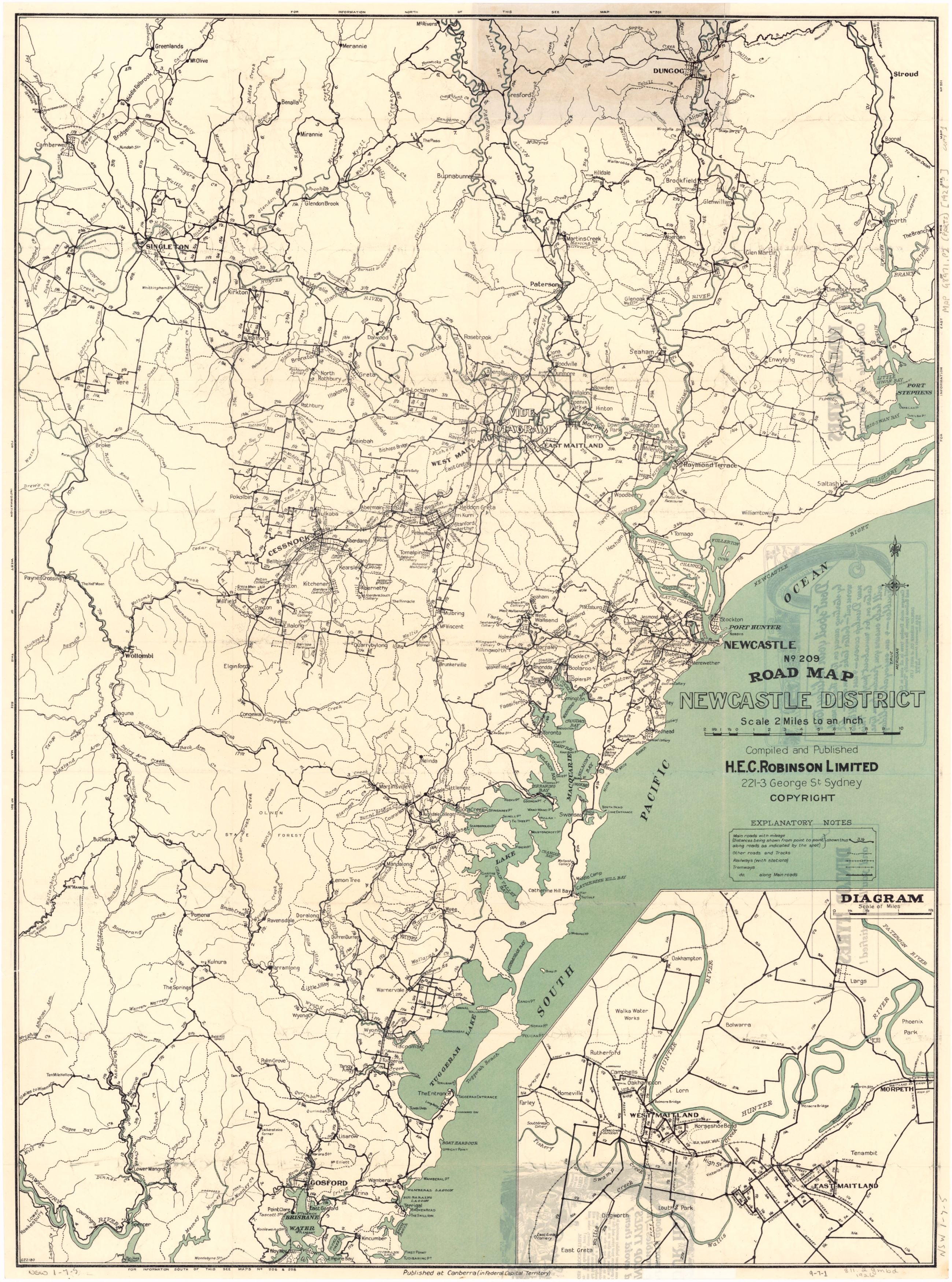 A classic wall map of the Newcastle area from 1928, published by the famous map makers H.E.C.Robinson of Sydney.