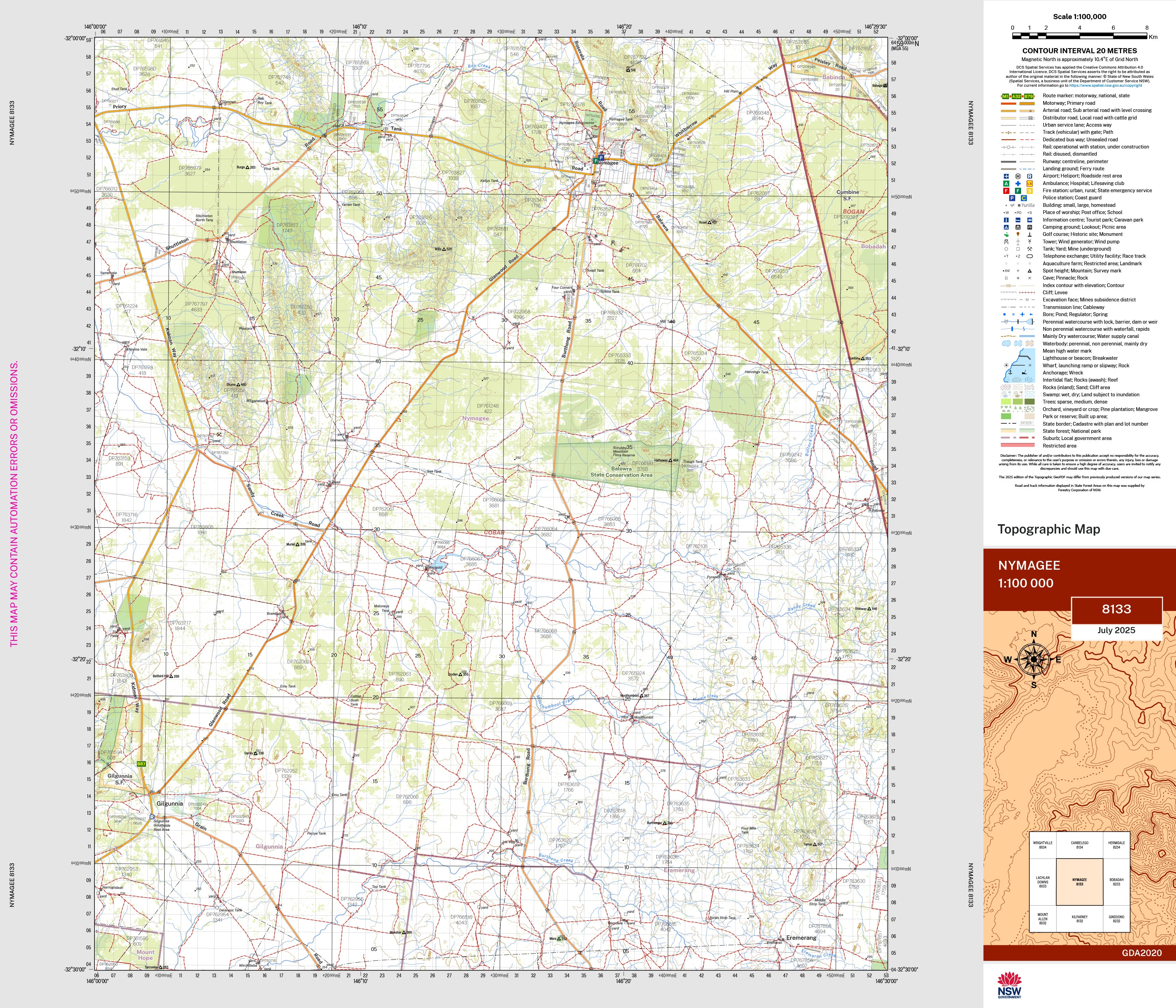 The Nymagee 1:100,000 scale New South Wales topographic map shows contours, streams, roads, tracks, buildings, place names, points of interest, vegetation, selected administrative boundaries and much more.