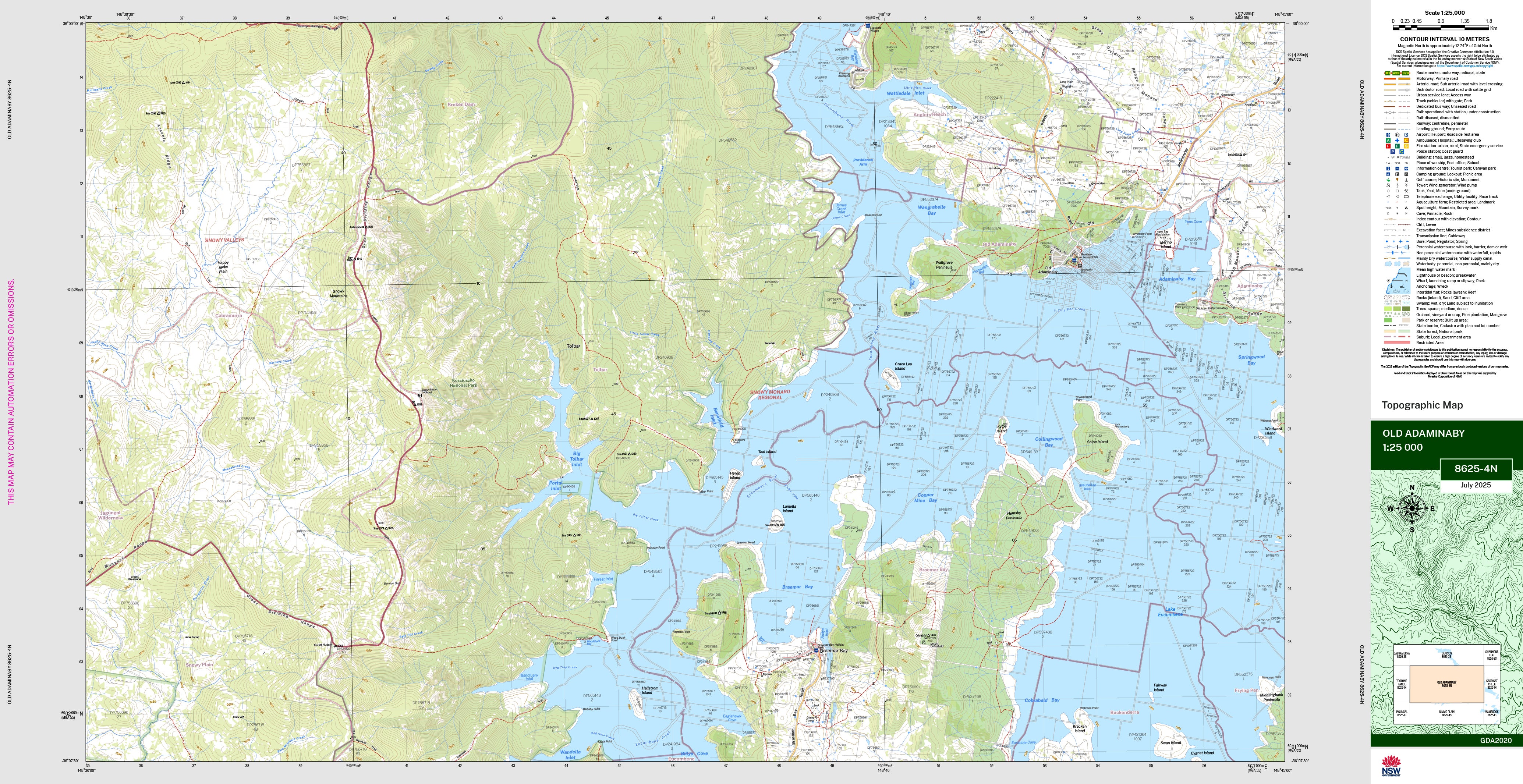 The Old Adaminaby 1:25,000 scale New South Wales topographic map shows contours, streams, roads, tracks, buildings, place names, points of interest, vegetation, selected administrative boundaries and much more.