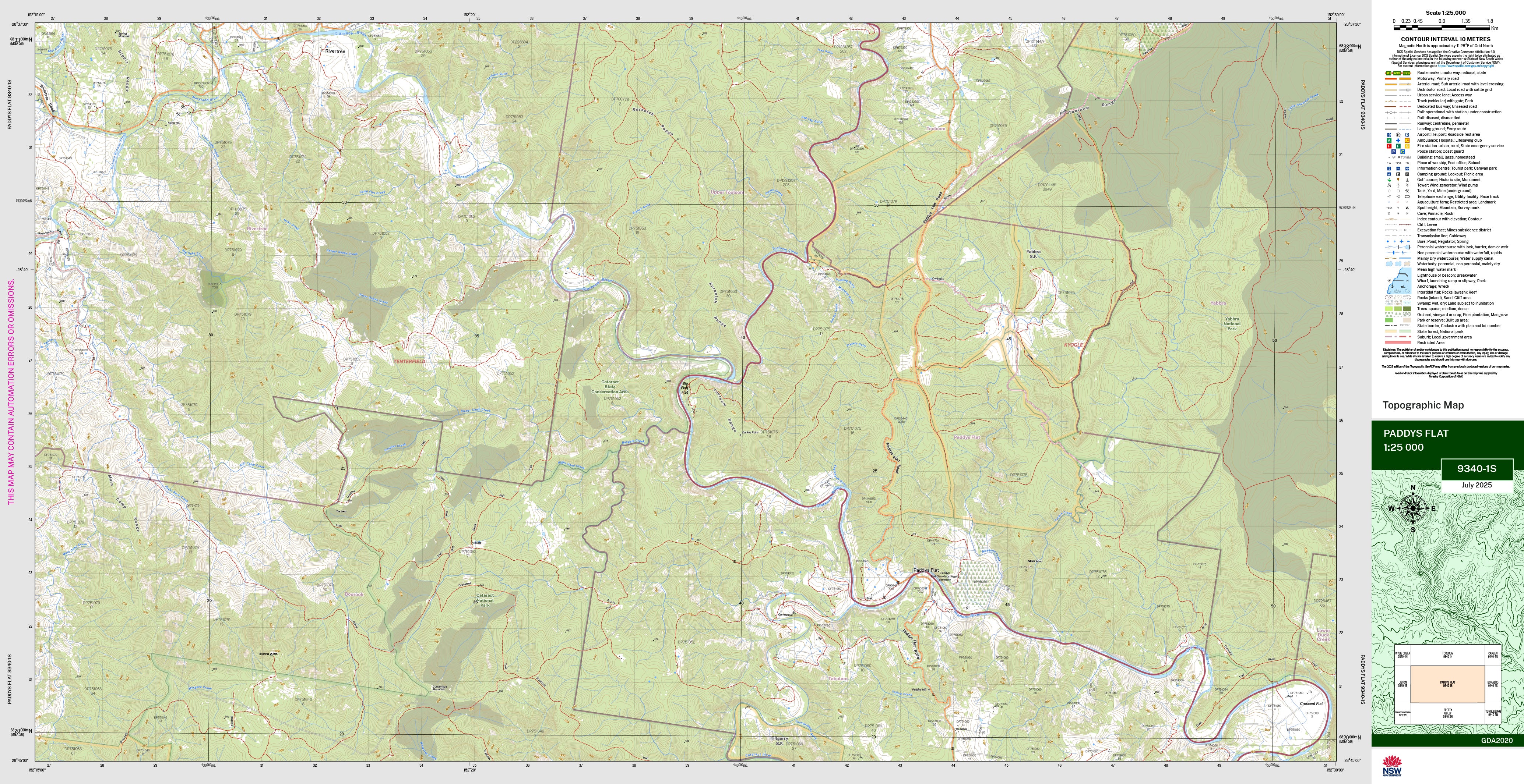 The Paddys Flat 1:25,000 scale New South Wales topographic map shows contours, streams, roads, tracks, buildings, place names, points of interest, vegetation, selected administrative boundaries and much more.