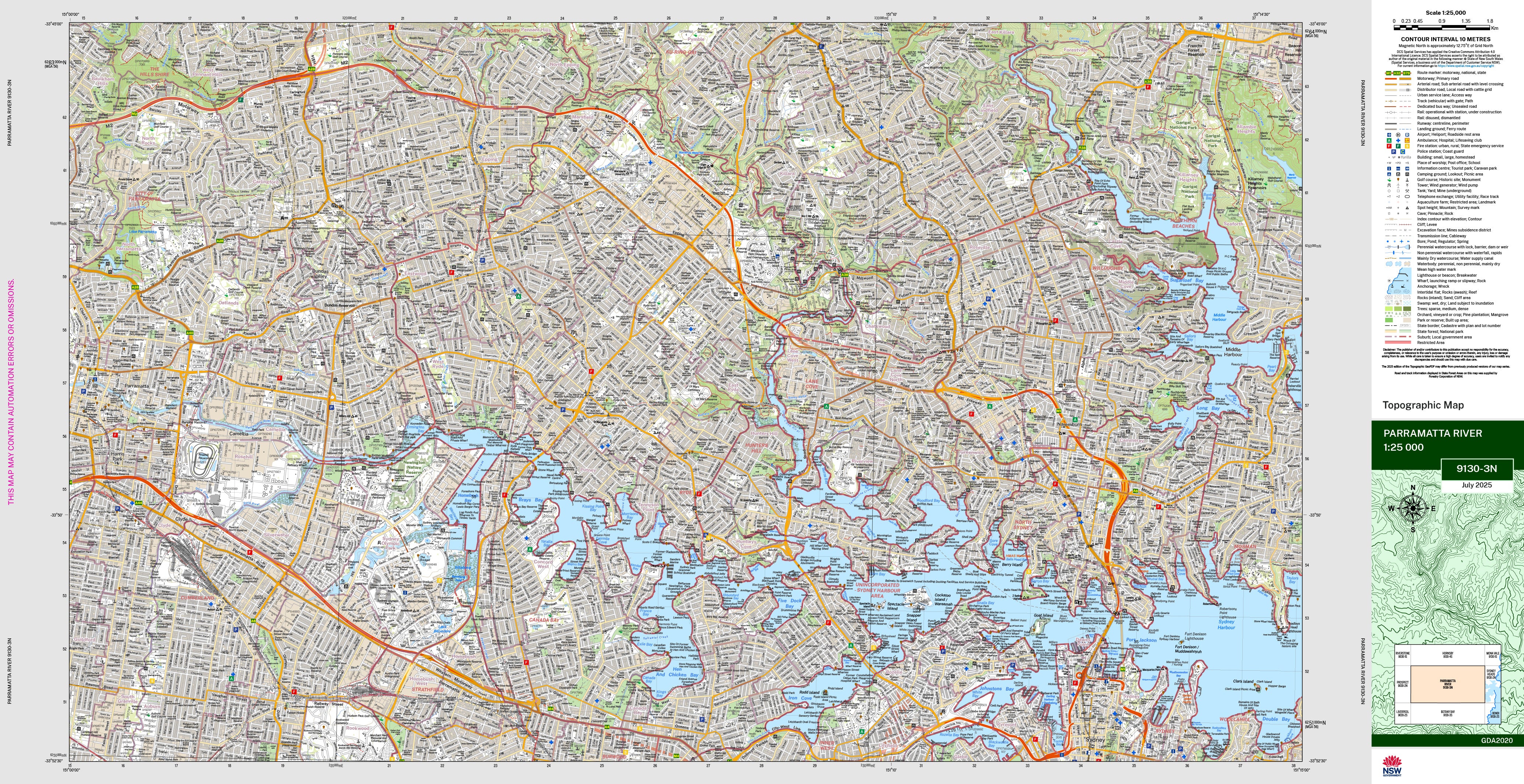 The Parramatta River topographic map by LPI shows contours, streams, roads, tracks, fire trails, buildings, place names, points of interest, vegetation, selected administrative boundaries and much more.