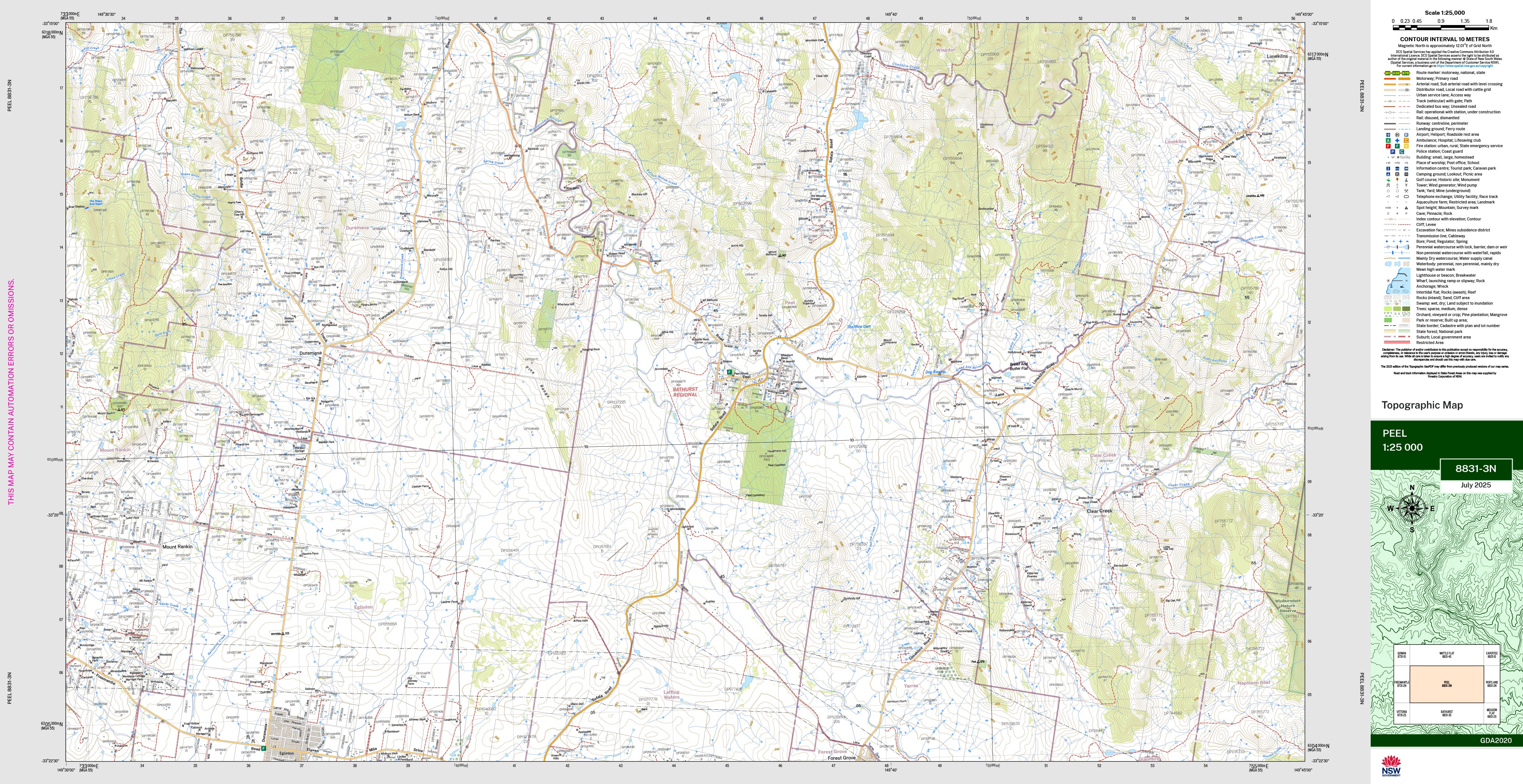 The Peel 1:25,000 scale New South Wales topographic map shows contours, streams, roads, tracks, buildings, place names, points of interest, vegetation, selected administrative boundaries and much more.