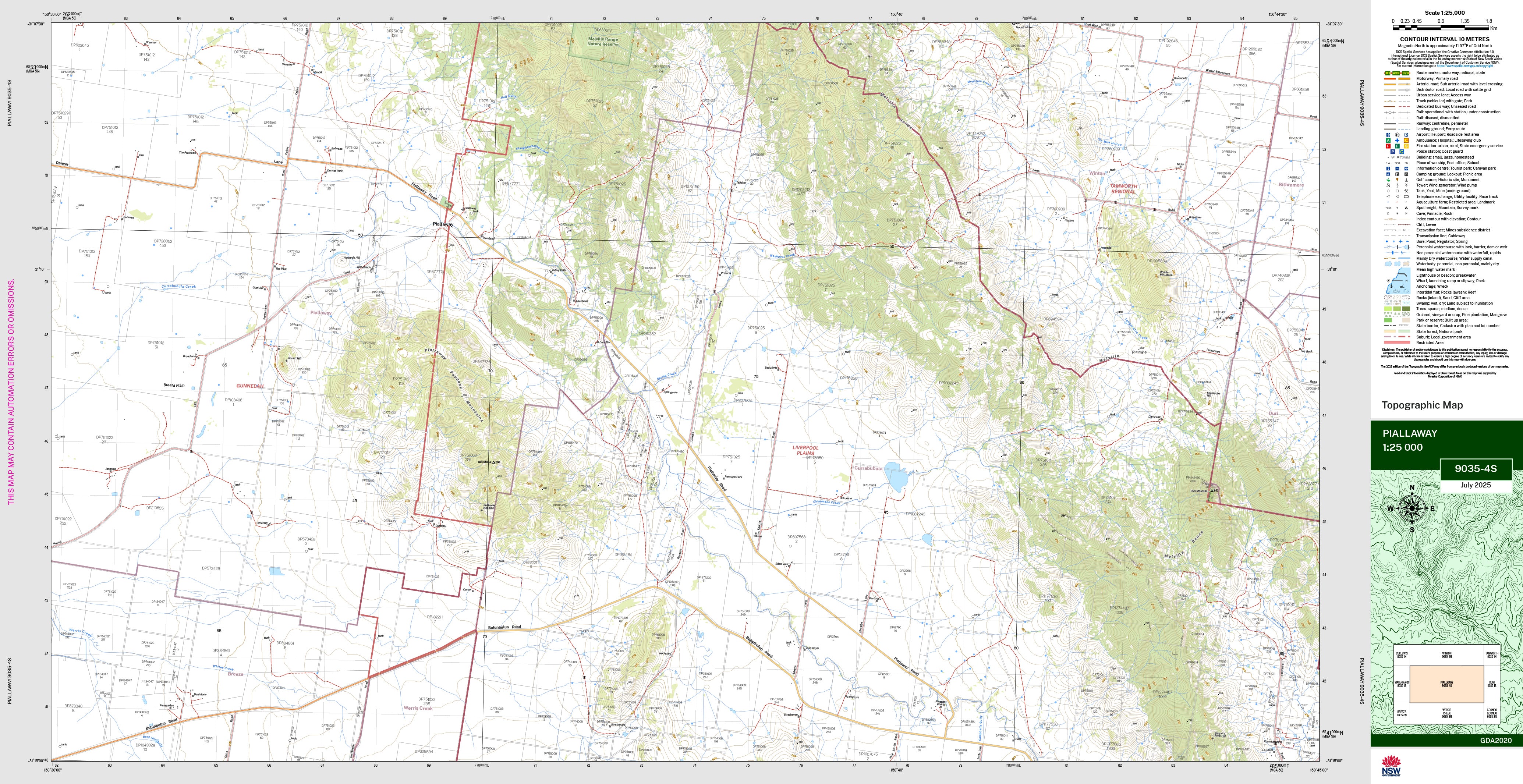 The Piallaway 1:25,000 scale New South Wales topographic map shows contours, streams, roads, tracks, buildings, place names, points of interest, vegetation, selected administrative boundaries and much more.