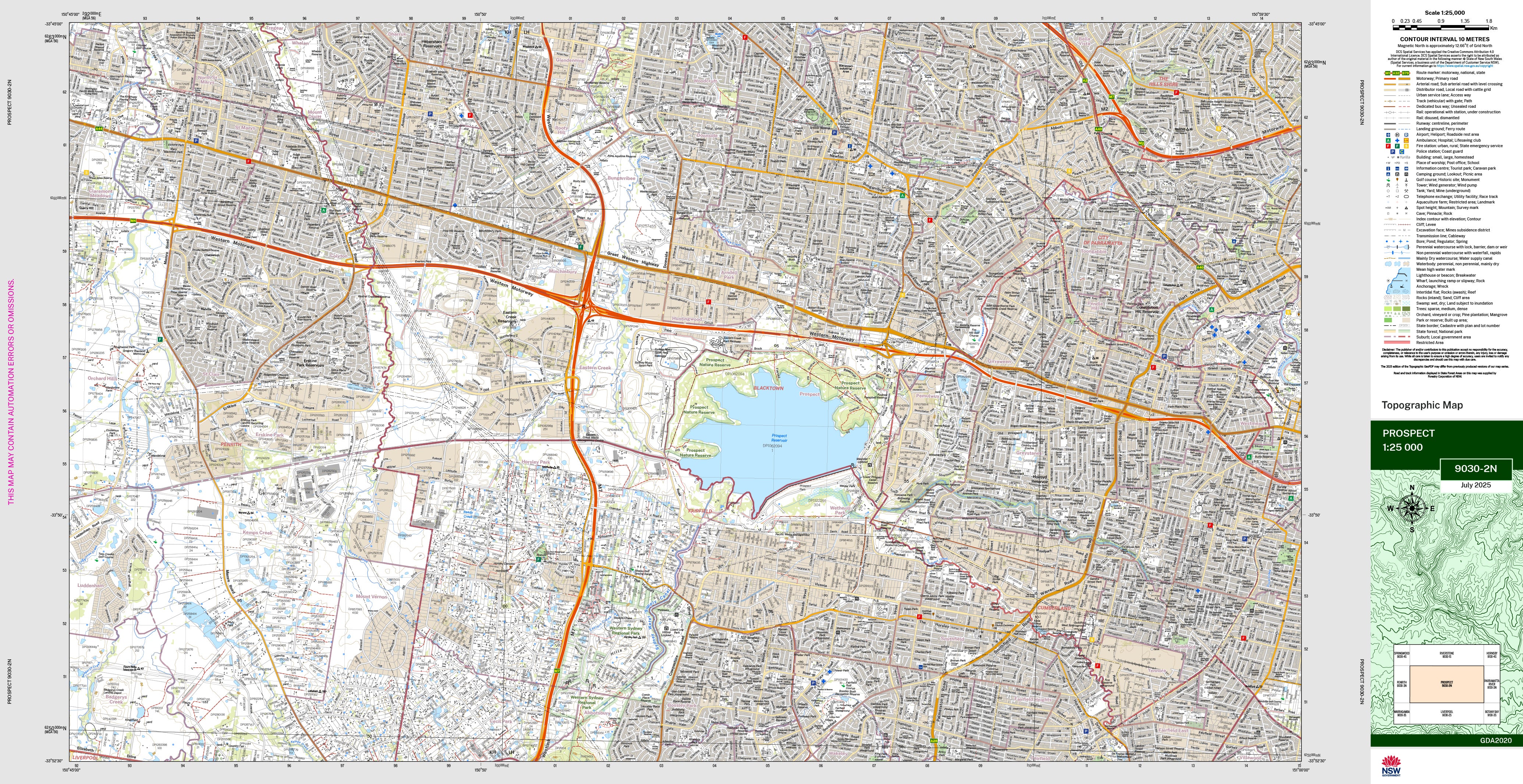 The Prospect 1:25,000 scale New South Wales topographic map shows contours, streams, roads, tracks, buildings, place names, points of interest, vegetation, selected administrative boundaries and much more.