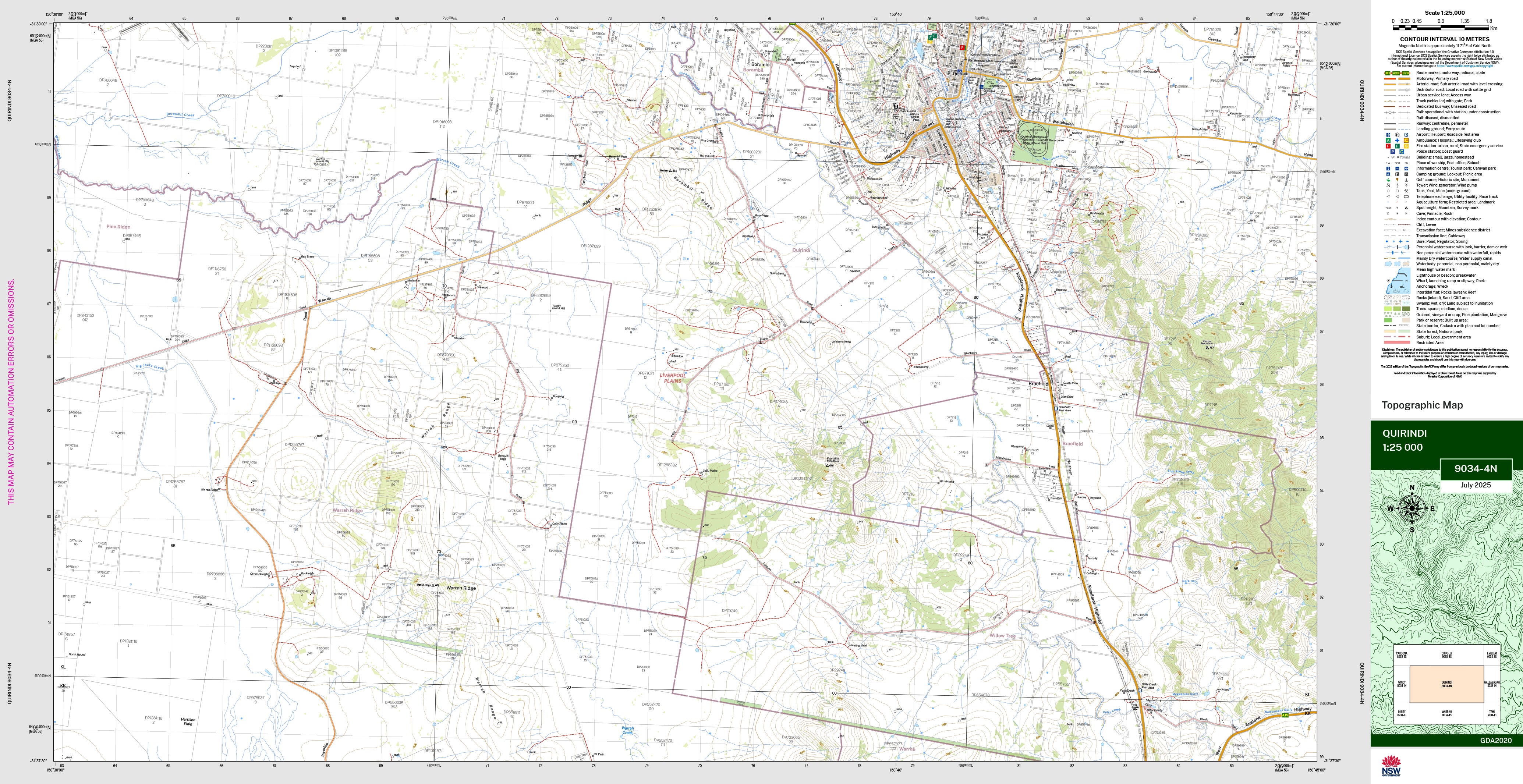 The Quirindi 1:25,000 scale New South Wales topographic map shows contours, streams, roads, tracks, buildings, place names, points of interest, vegetation, selected administrative boundaries and much more.