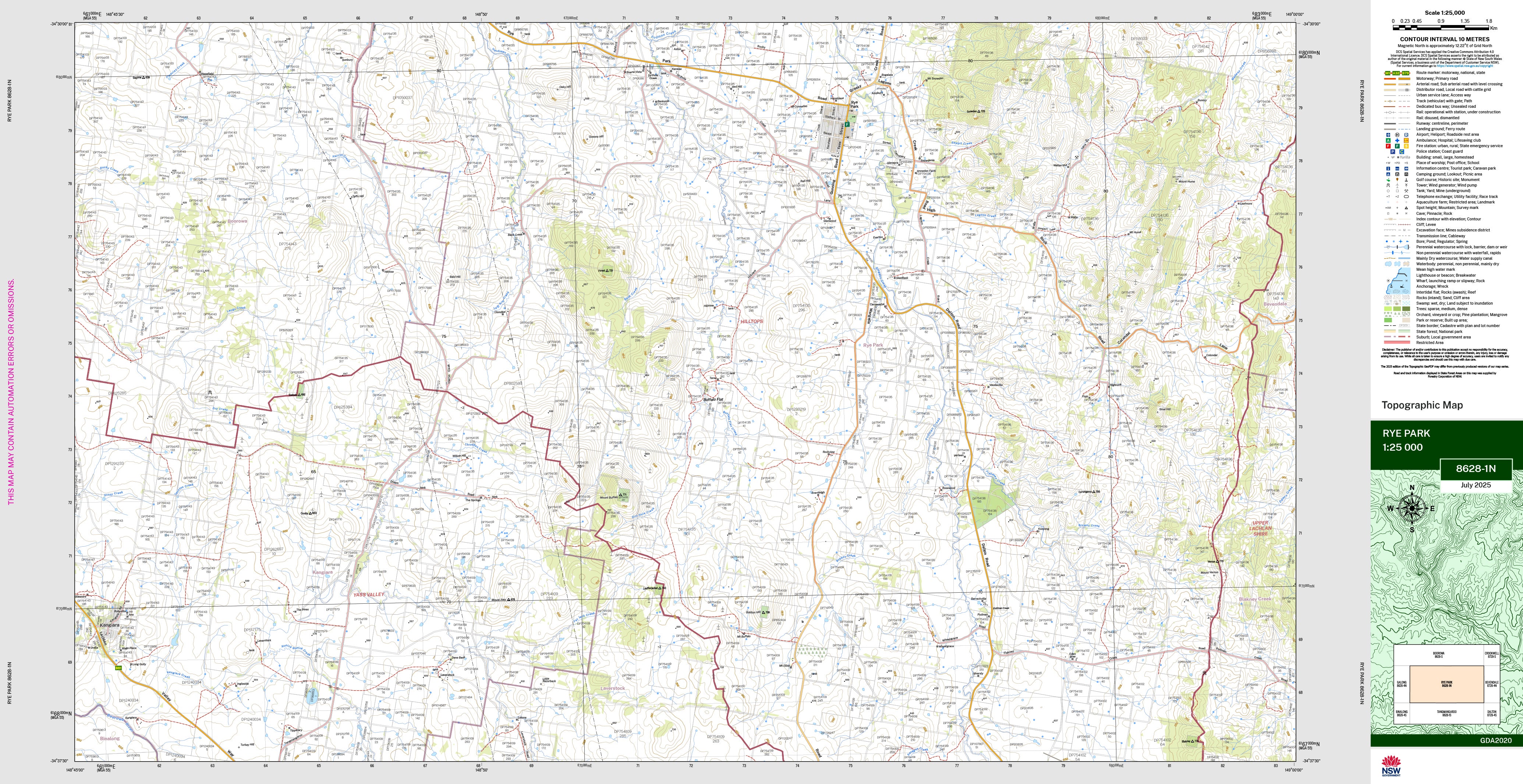 The Rye Park 1:25,000 scale New South Wales topographic map shows contours, streams, roads, tracks, buildings, place names, points of interest, vegetation, selected administrative boundaries and much more.