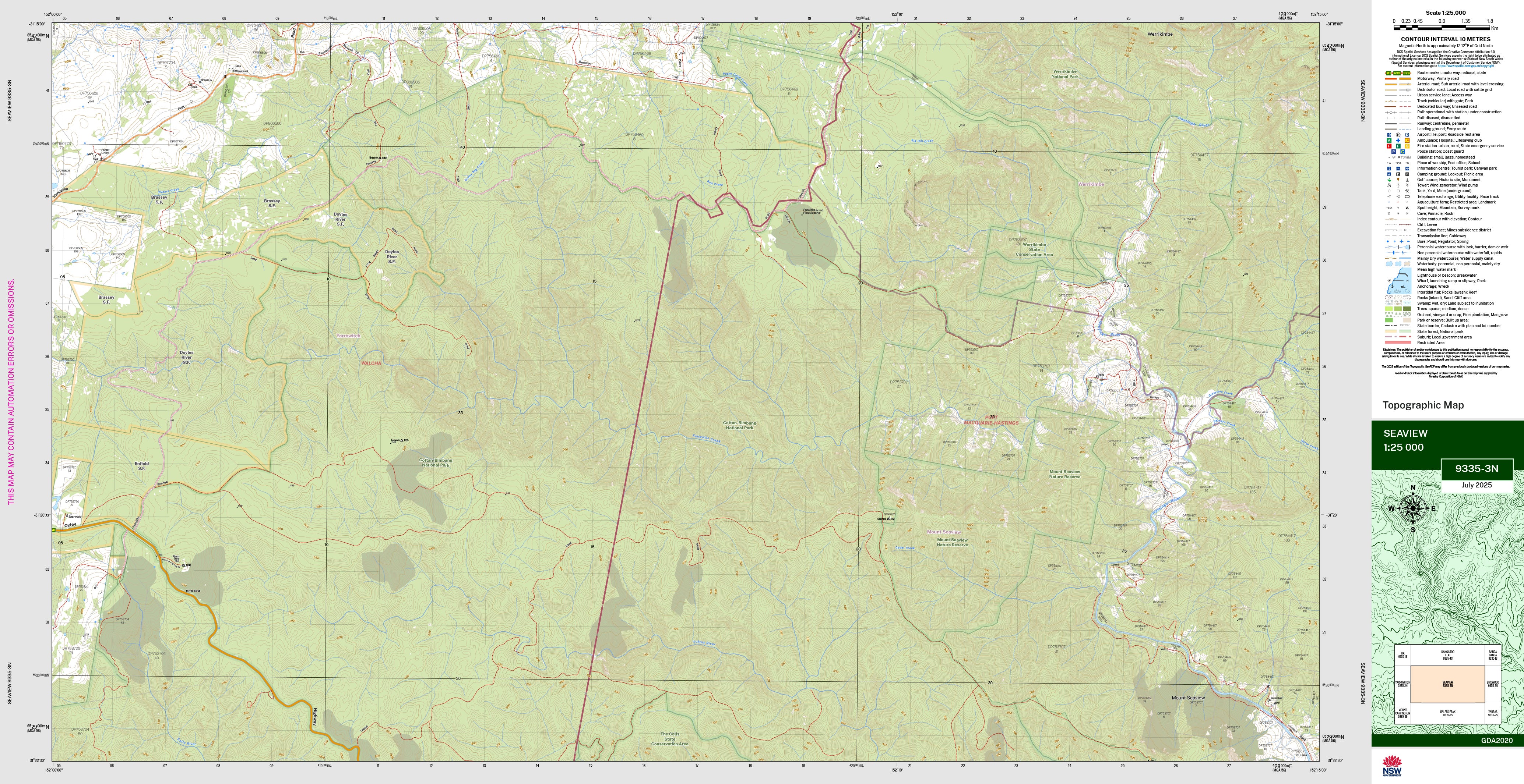 The Seaview 1:25,000 scale New South Wales topographic map shows contours, streams, roads, tracks, buildings, place names, points of interest, vegetation, selected administrative boundaries and much more.