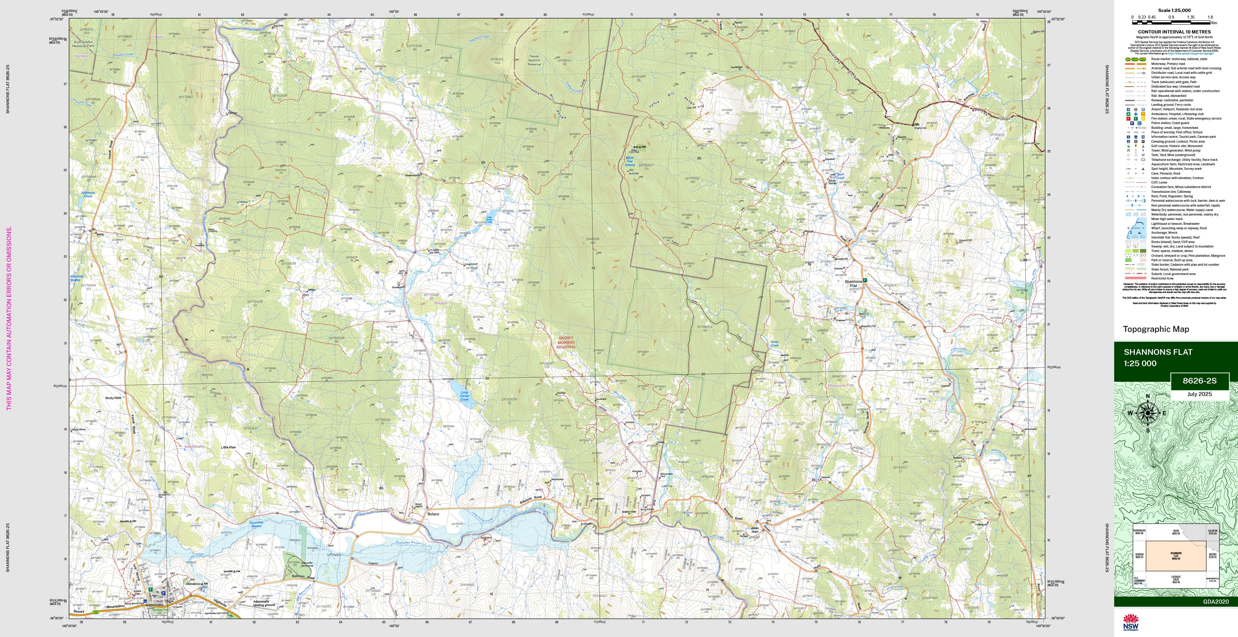 The Shannons Flat 1:25,000 scale New South Wales topographic map shows contours, streams, roads, tracks, buildings, place names, points of interest, vegetation, selected administrative boundaries and much more.