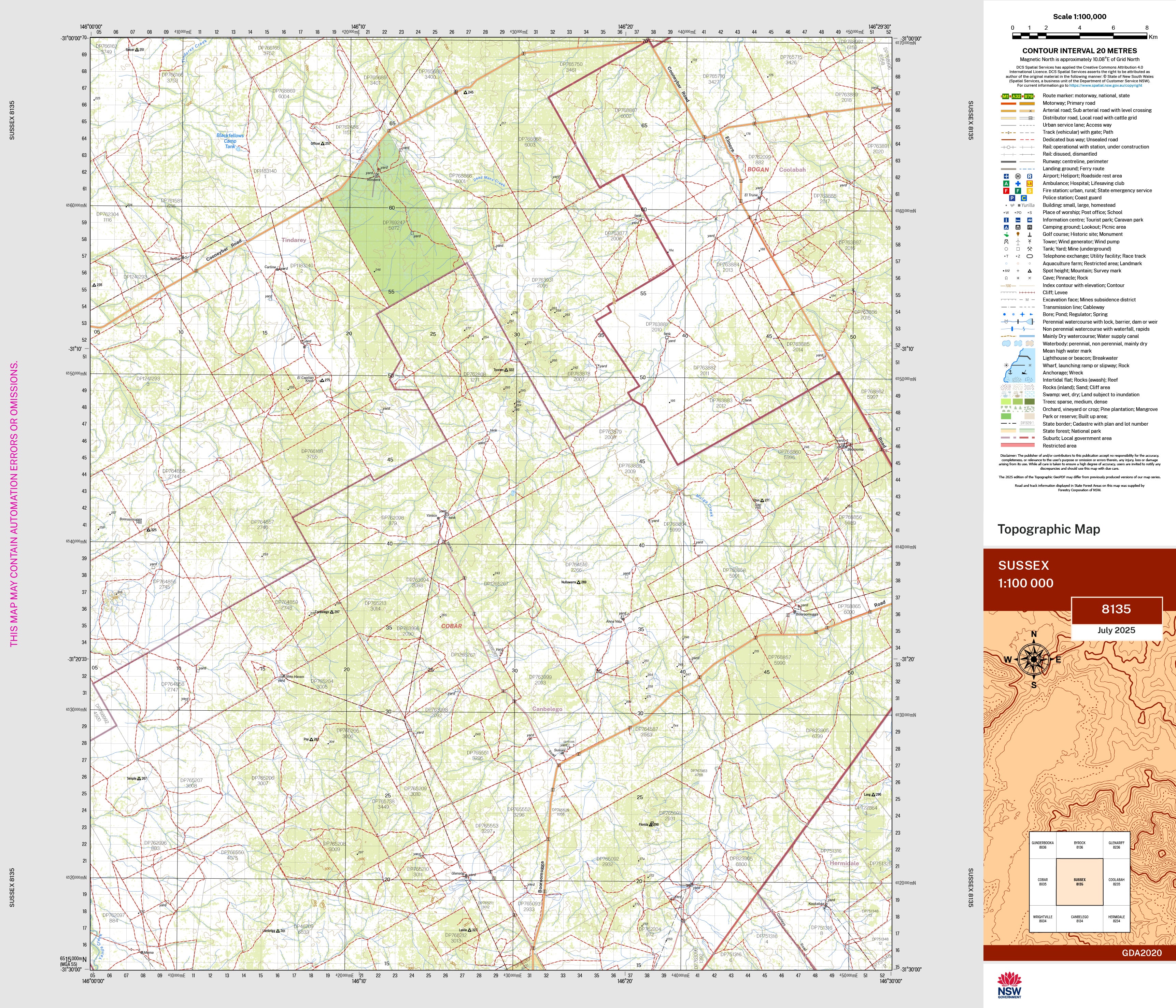 The Sussex 1:100,000 scale New South Wales topographic map shows contours, streams, roads, tracks, buildings, place names, points of interest, vegetation, selected administrative boundaries and much more.