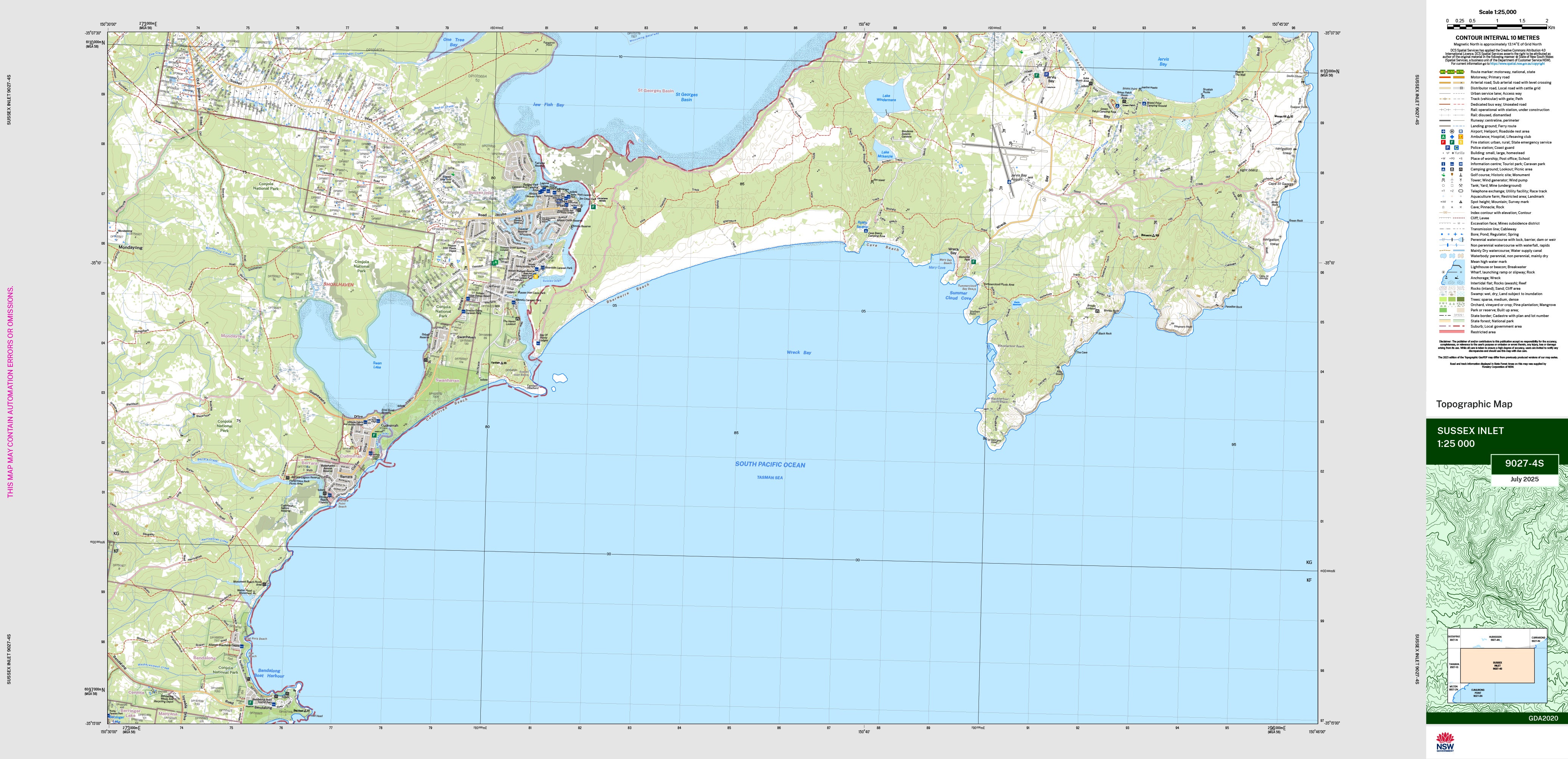 The Sussex Inlet 1:25,000 scale New South Wales topographic map shows contours, streams, roads, tracks, buildings, place names, points of interest, vegetation, selected administrative boundaries and much more.