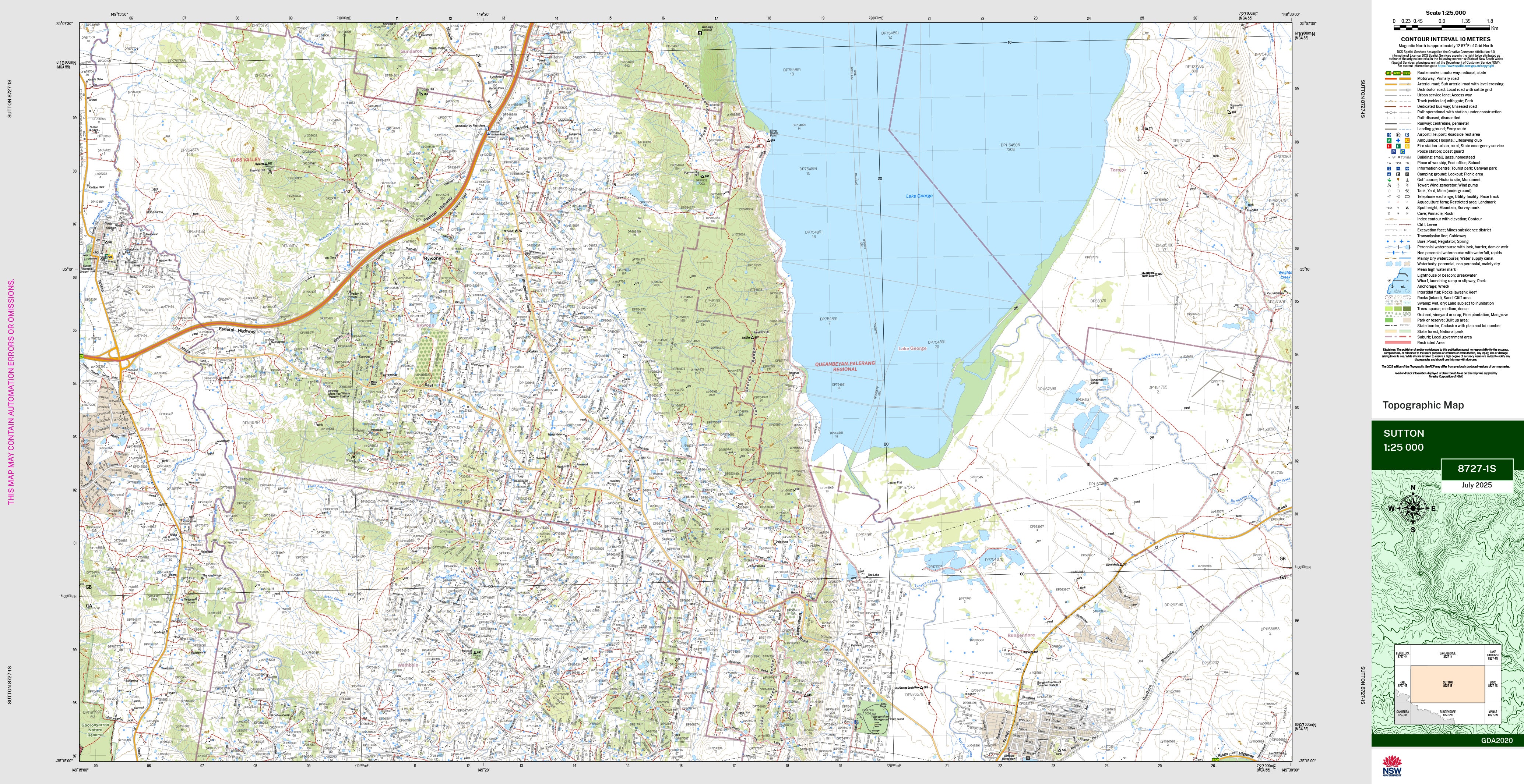The Sutton 1:25,000 scale New South Wales topographic map shows contours, streams, roads, tracks, buildings, place names, points of interest, vegetation, selected administrative boundaries and much more.