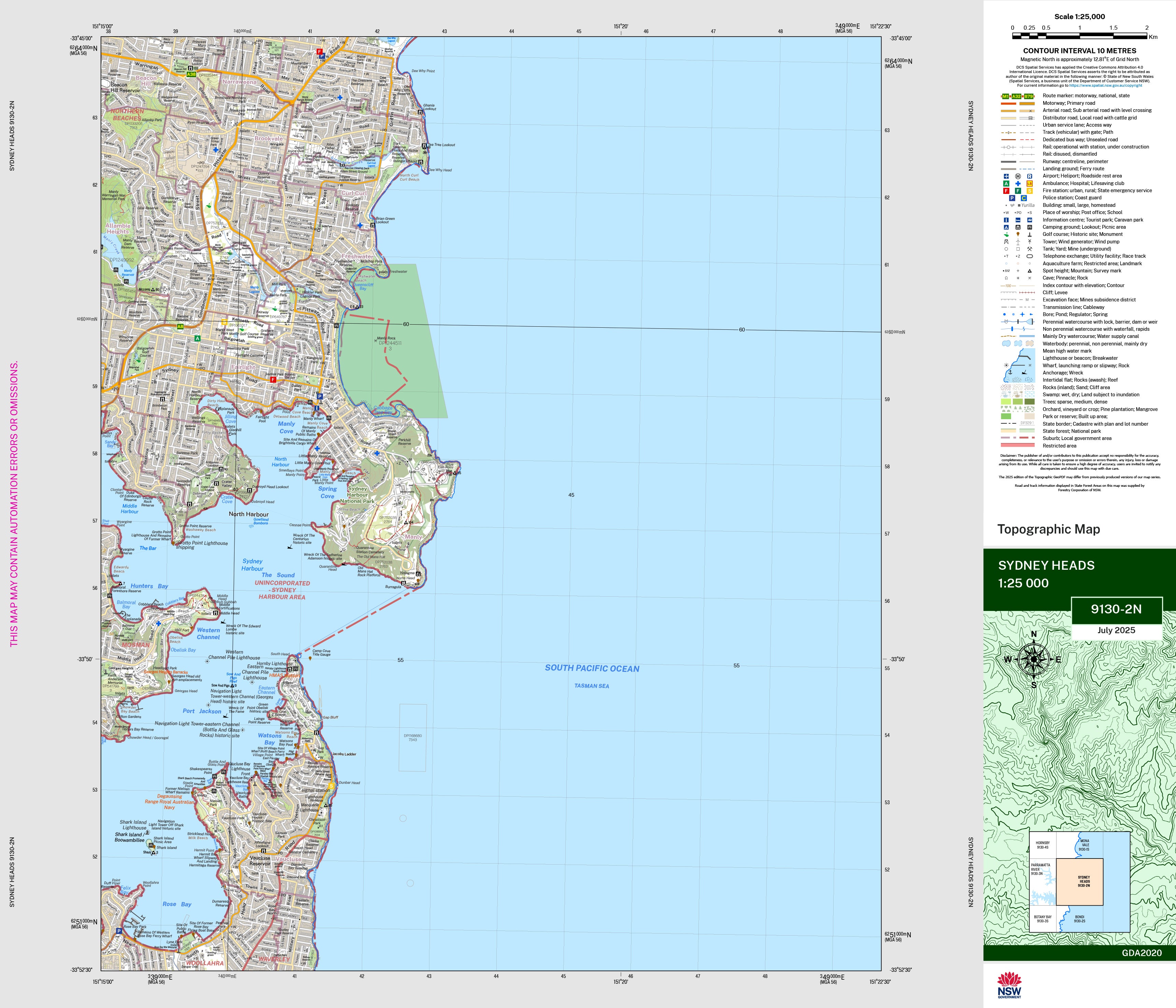 The Sydney Heads 1:25,000 scale New South Wales topographic map shows contours, streams, roads, tracks, buildings, place names, points of interest, vegetation, selected administrative boundaries and much more.