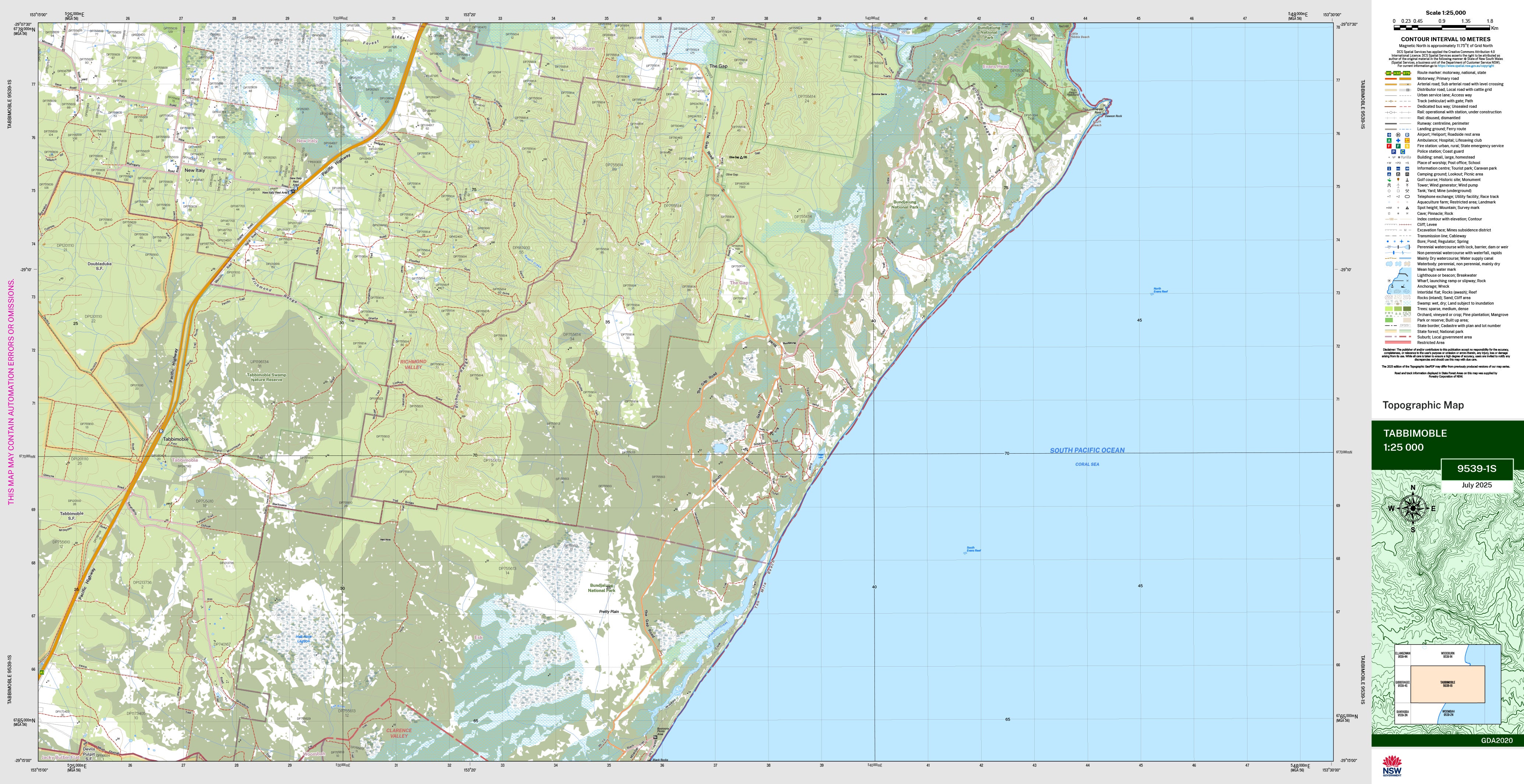 The Tabbimoble 1:25,000 scale New South Wales topographic map shows contours, streams, roads, tracks, buildings, place names, points of interest, vegetation, selected administrative boundaries and much more.
