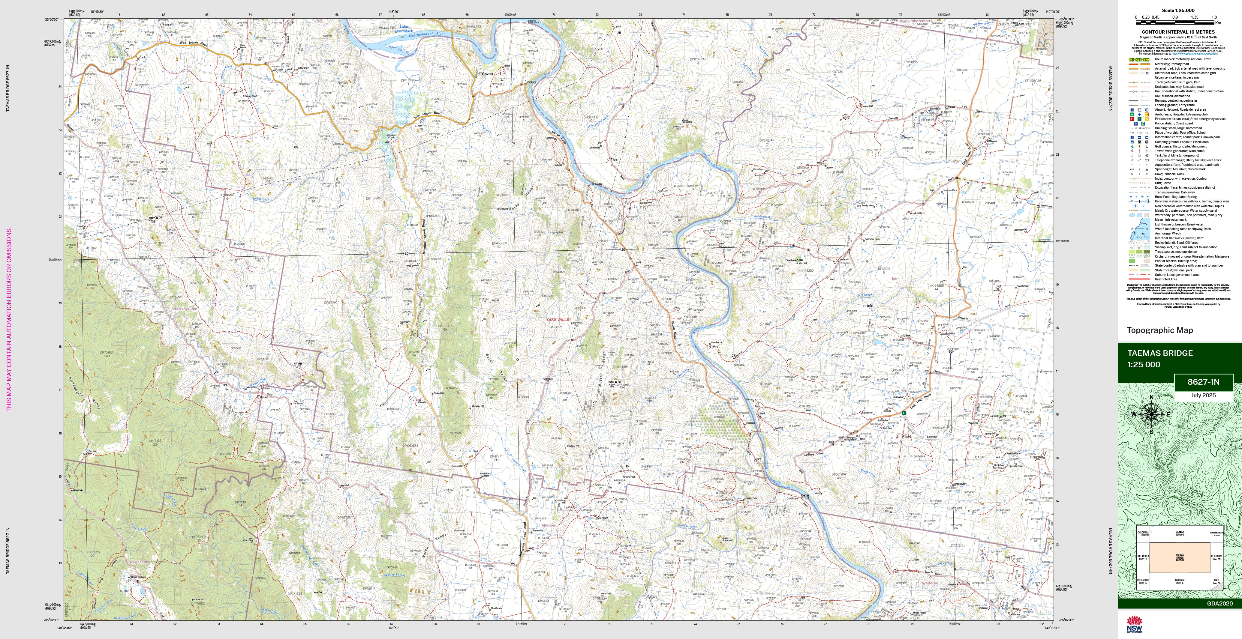 The Taemas Bridge 1:25,000 scale New South Wales topographic map shows contours, streams, roads, tracks, buildings, place names, points of interest, vegetation, selected administrative boundaries and much more.