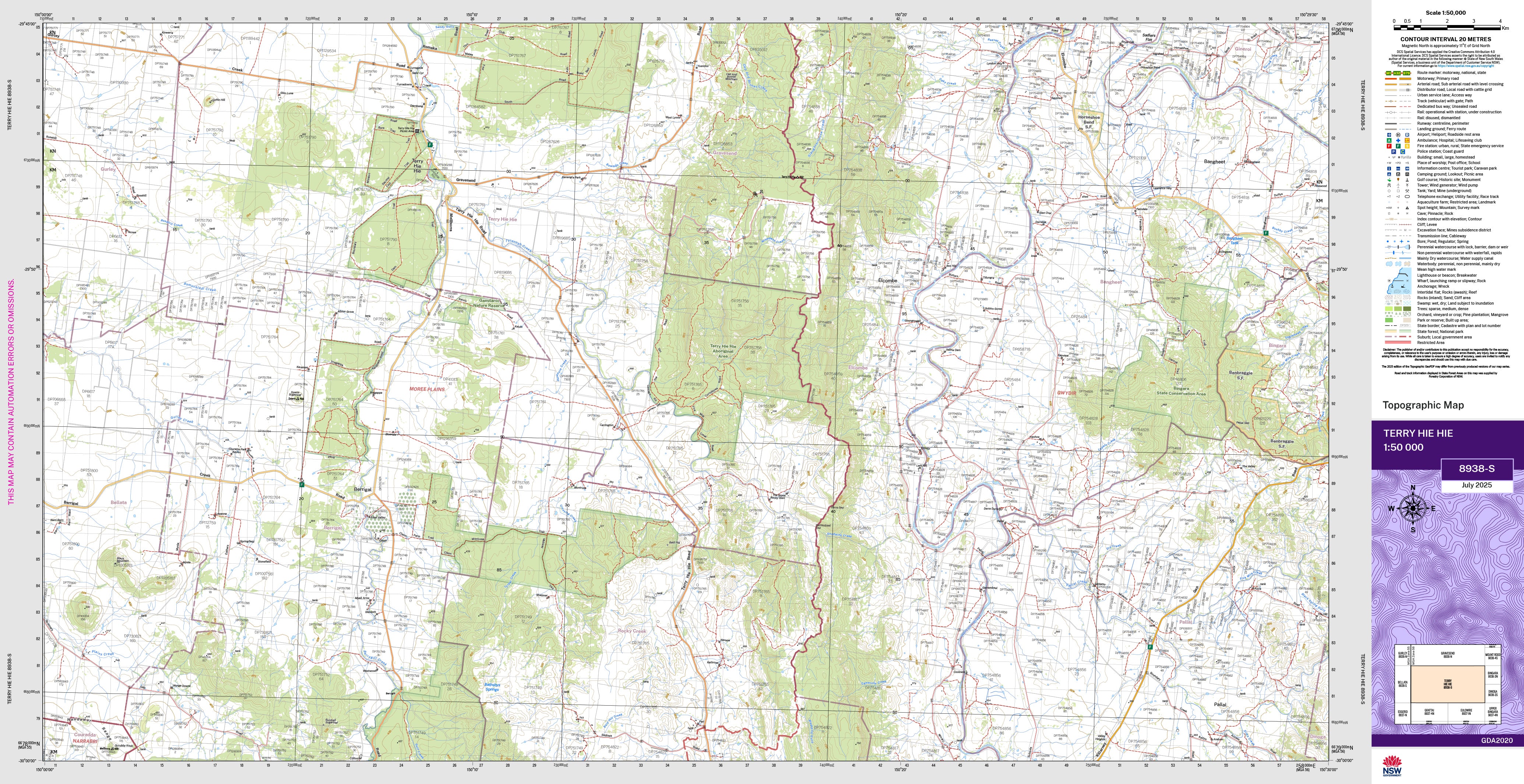 The Terry Hie Hie 1:50,000 scale New South Wales topographic map shows contours, streams, roads, tracks, buildings, place names, points of interest, vegetation, selected administrative boundaries and much more.