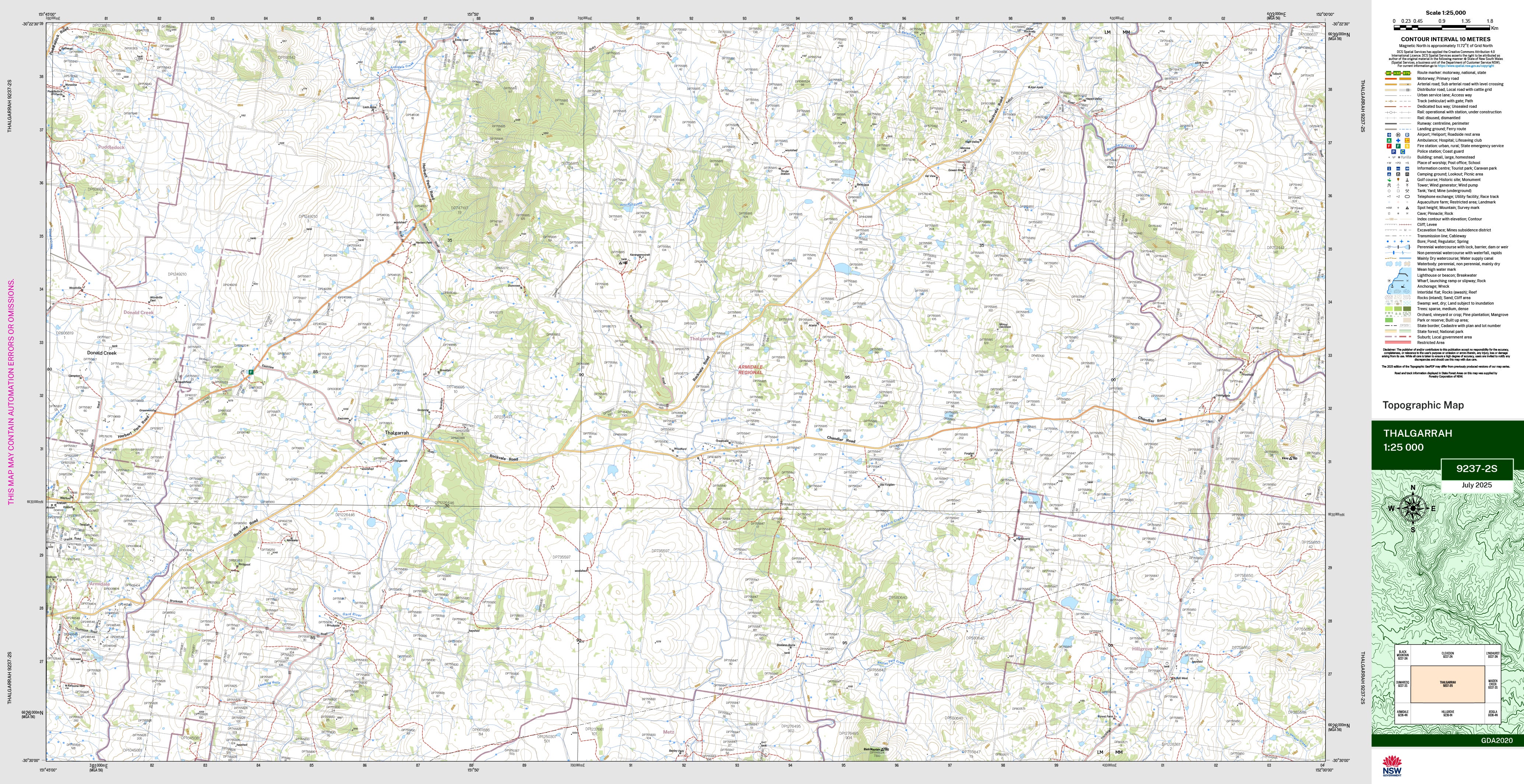 The Thalgarrah 1:25,000 scale New South Wales topographic map shows contours, streams, roads, tracks, buildings, place names, points of interest, vegetation, selected administrative boundaries and much more.