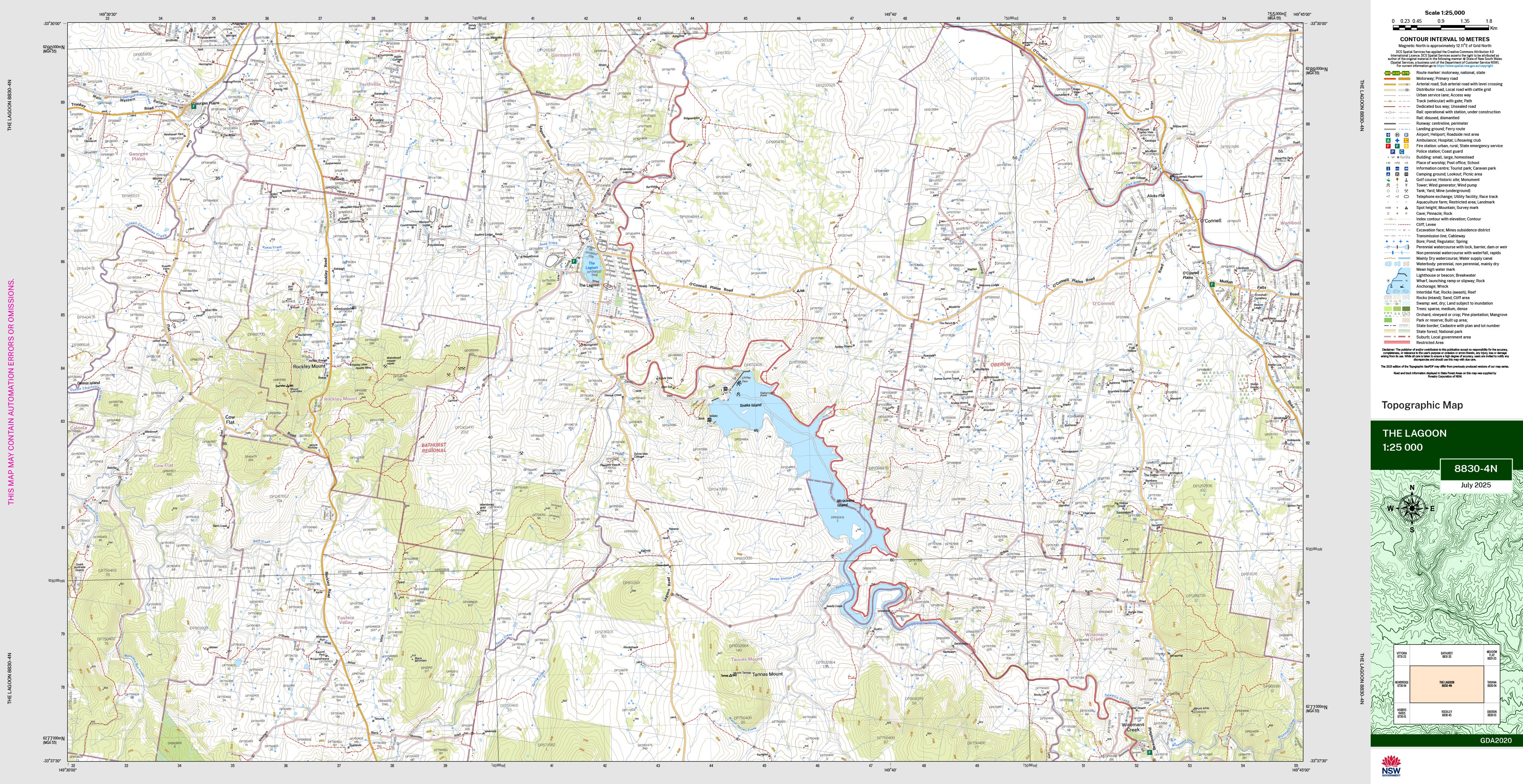 The Lagoon 1:25,000 scale New South Wales topographic map shows contours, streams, roads, tracks, buildings, place names, points of interest, vegetation, selected administrative boundaries and much more.