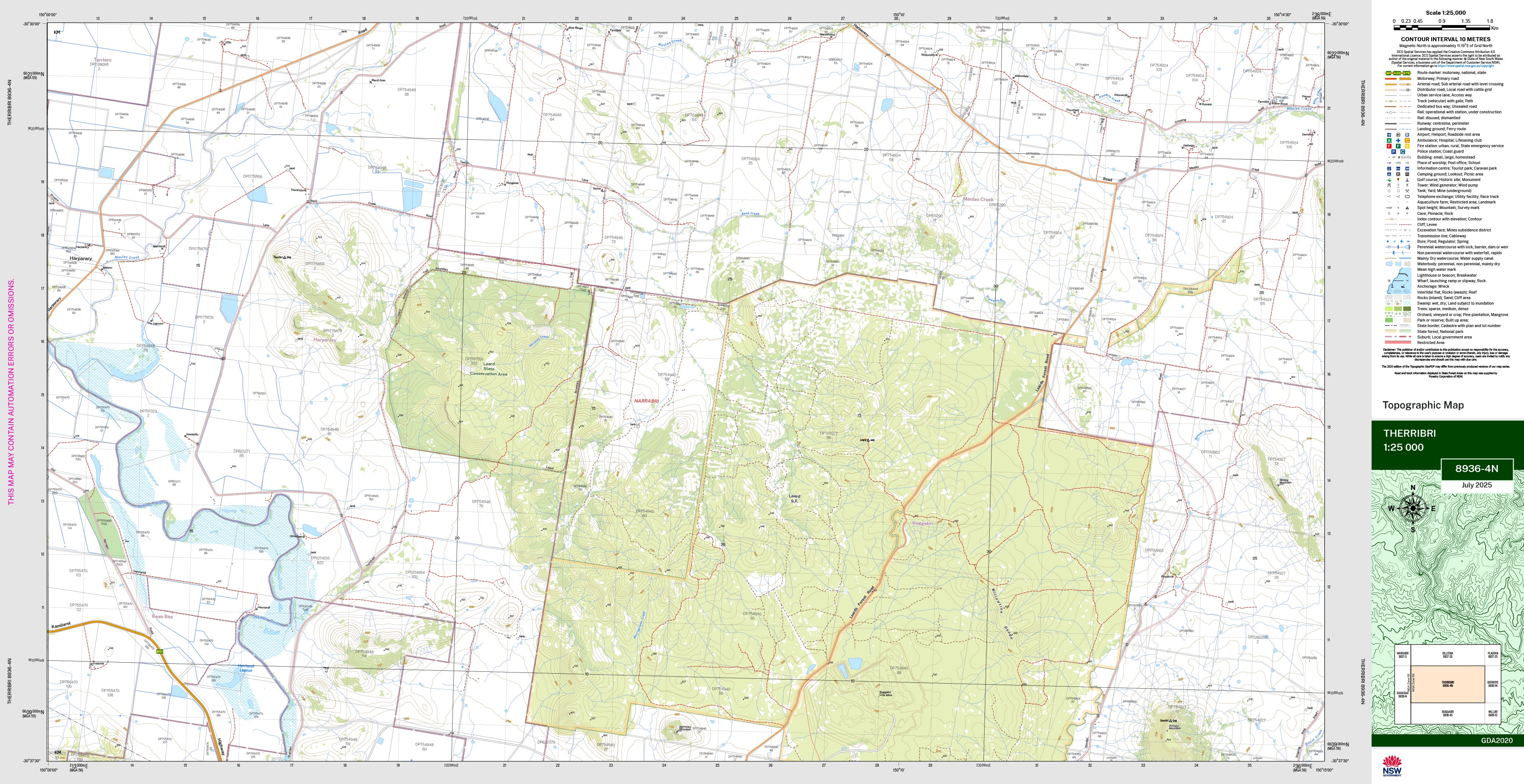 The Therribri 1:25,000 scale New South Wales topographic map shows contours, streams, roads, tracks, buildings, place names, points of interest, vegetation, selected administrative boundaries and much more.