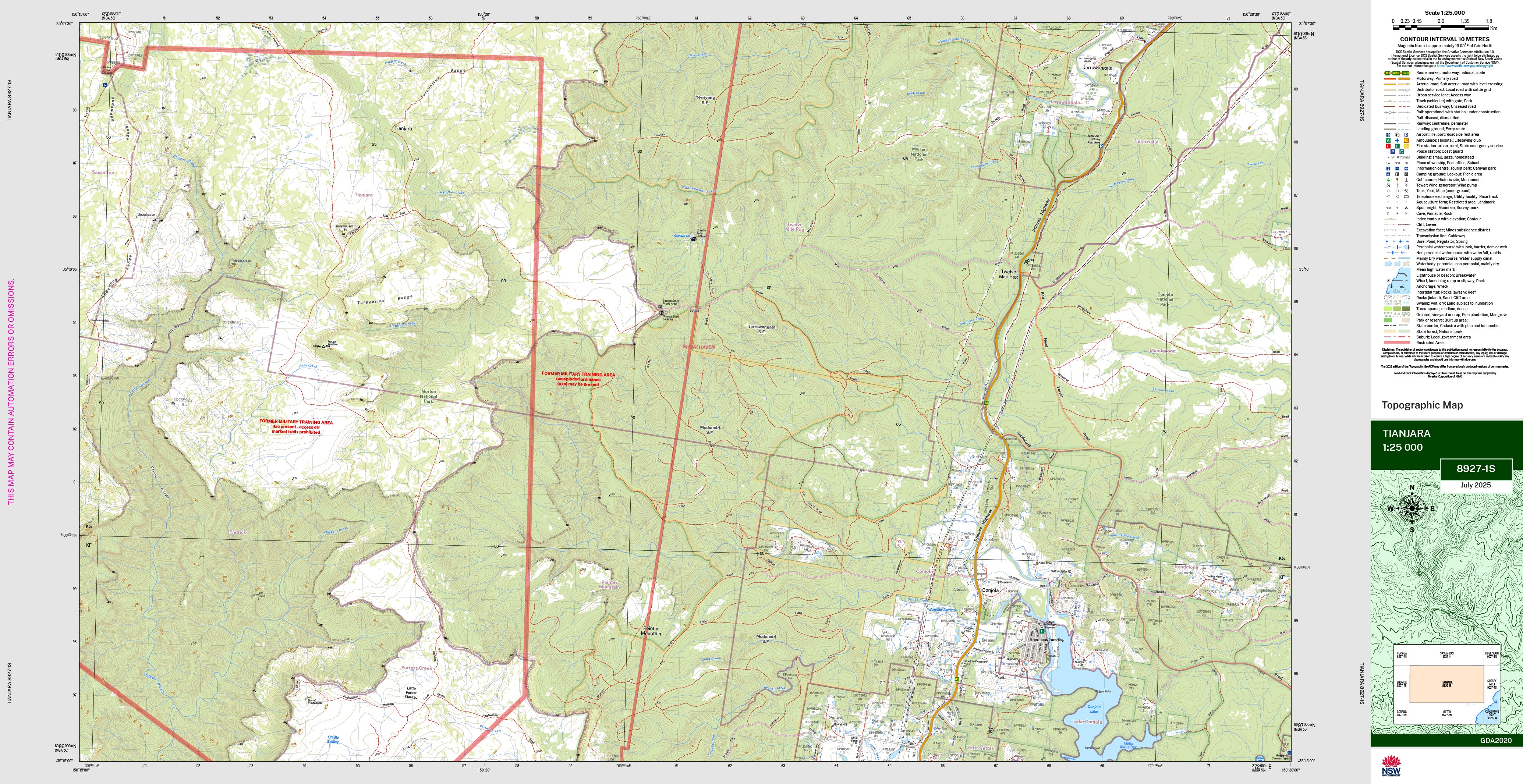 The Tianjara 1:25,000 scale New South Wales topographic map shows contours, streams, roads, tracks, buildings, place names, points of interest, vegetation, selected administrative boundaries and much more.