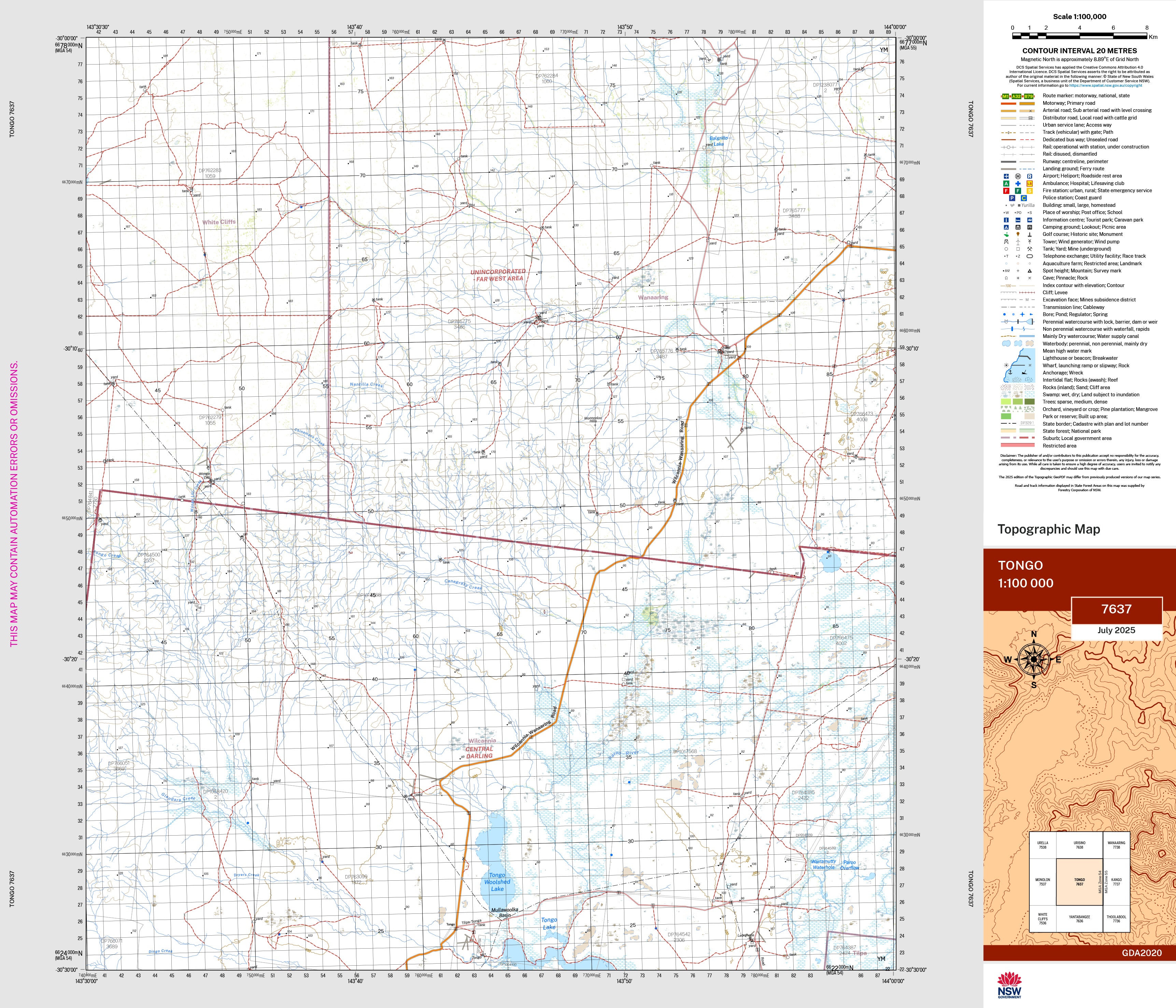 The Tongo 1:100,000 scale New South Wales topographic map shows contours, streams, roads, tracks, buildings, place names, points of interest, vegetation, selected administrative boundaries and much more.