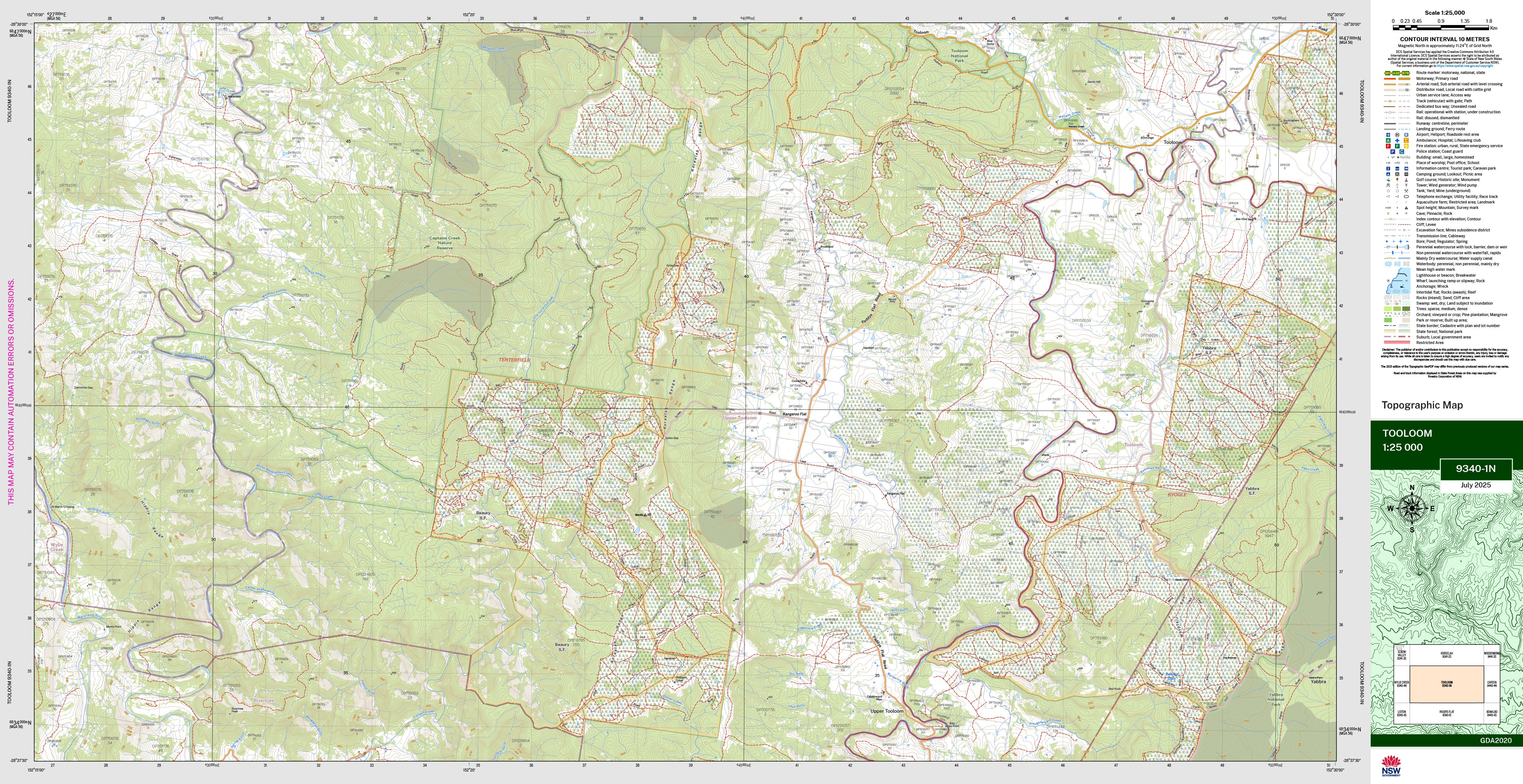The Tooloom 1:25,000 scale New South Wales topographic map shows contours, streams, roads, tracks, buildings, place names, points of interest, vegetation, selected administrative boundaries and much more.