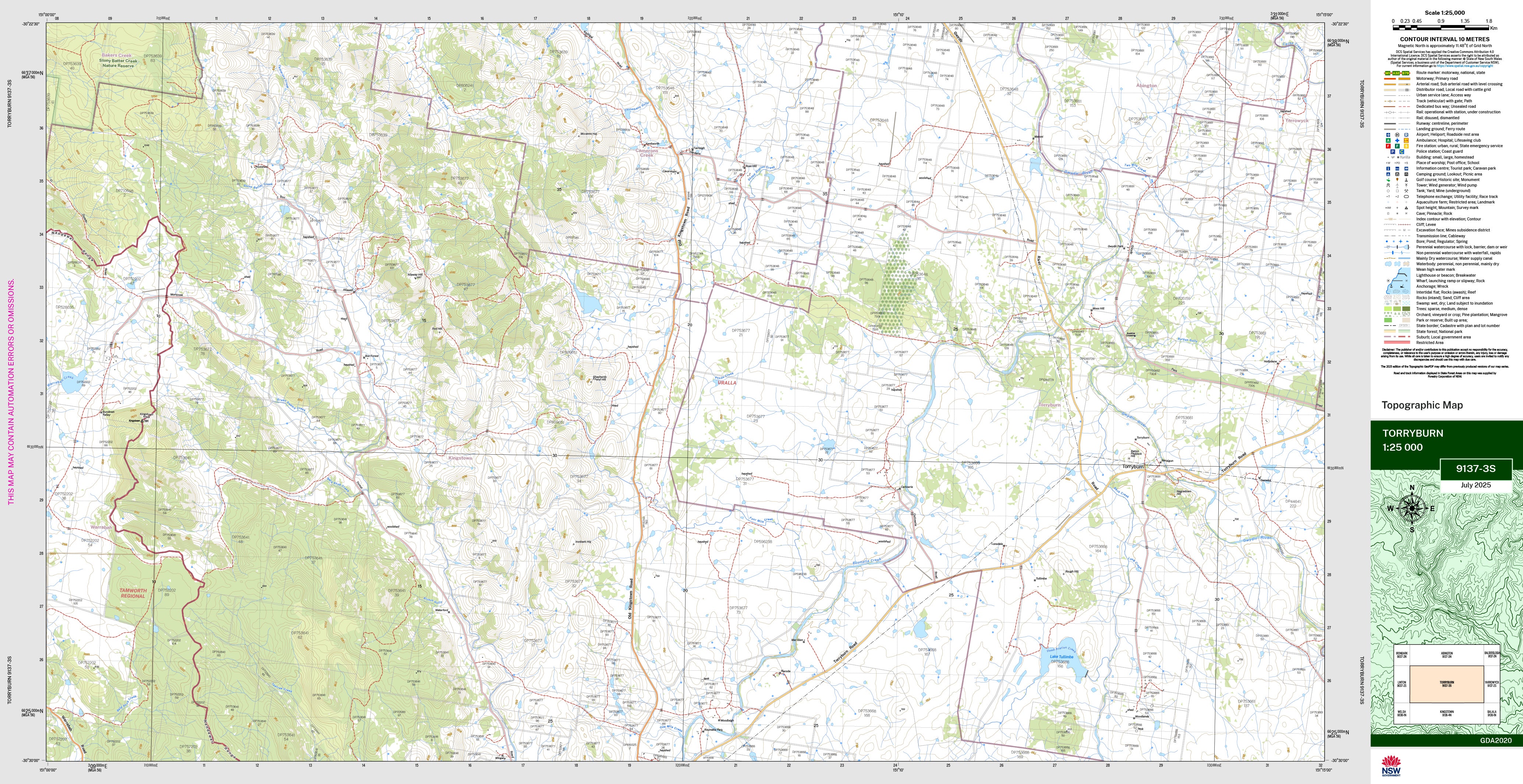 The Torryburn 1:25,000 scale New South Wales topographic map shows contours, streams, roads, tracks, buildings, place names, points of interest, vegetation, selected administrative boundaries and much more.