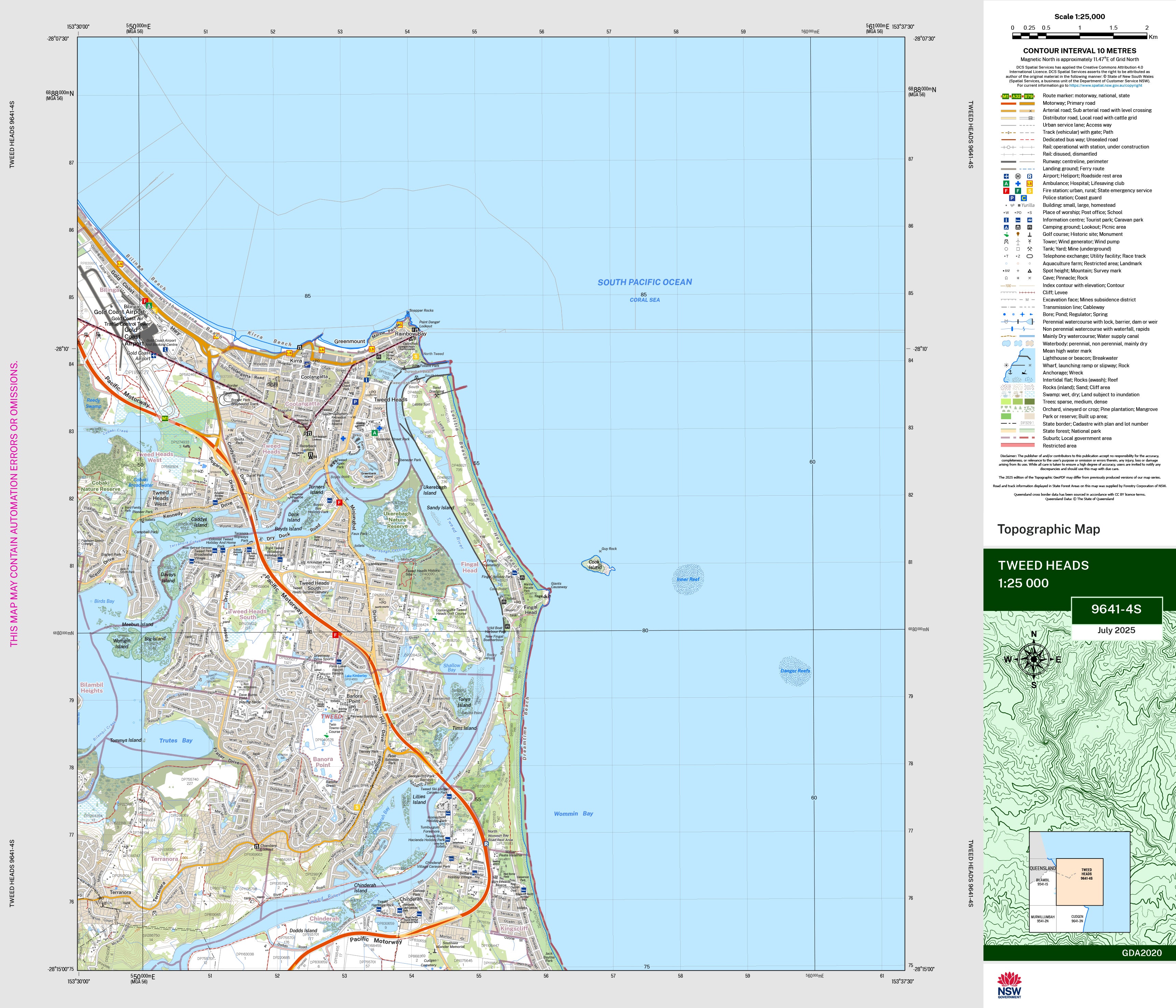 The Tweed Heads 1:25,000 scale New South Wales topographic map shows contours, streams, roads, tracks, buildings, place names, points of interest, vegetation, selected administrative boundaries and much more.