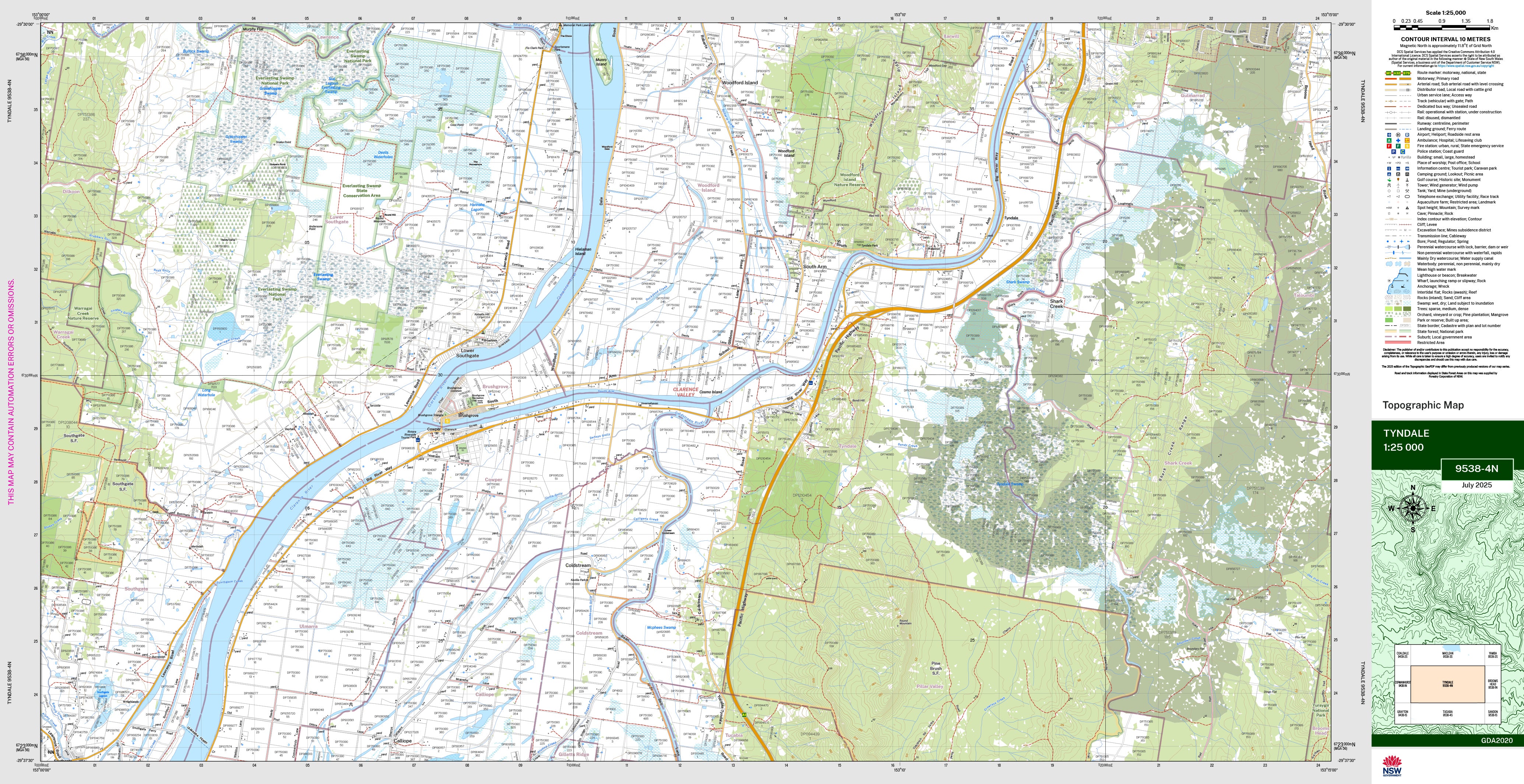 The Tyndale 1:25,000 scale New South Wales topographic map shows contours, streams, roads, tracks, buildings, place names, points of interest, vegetation, selected administrative boundaries and much more.
