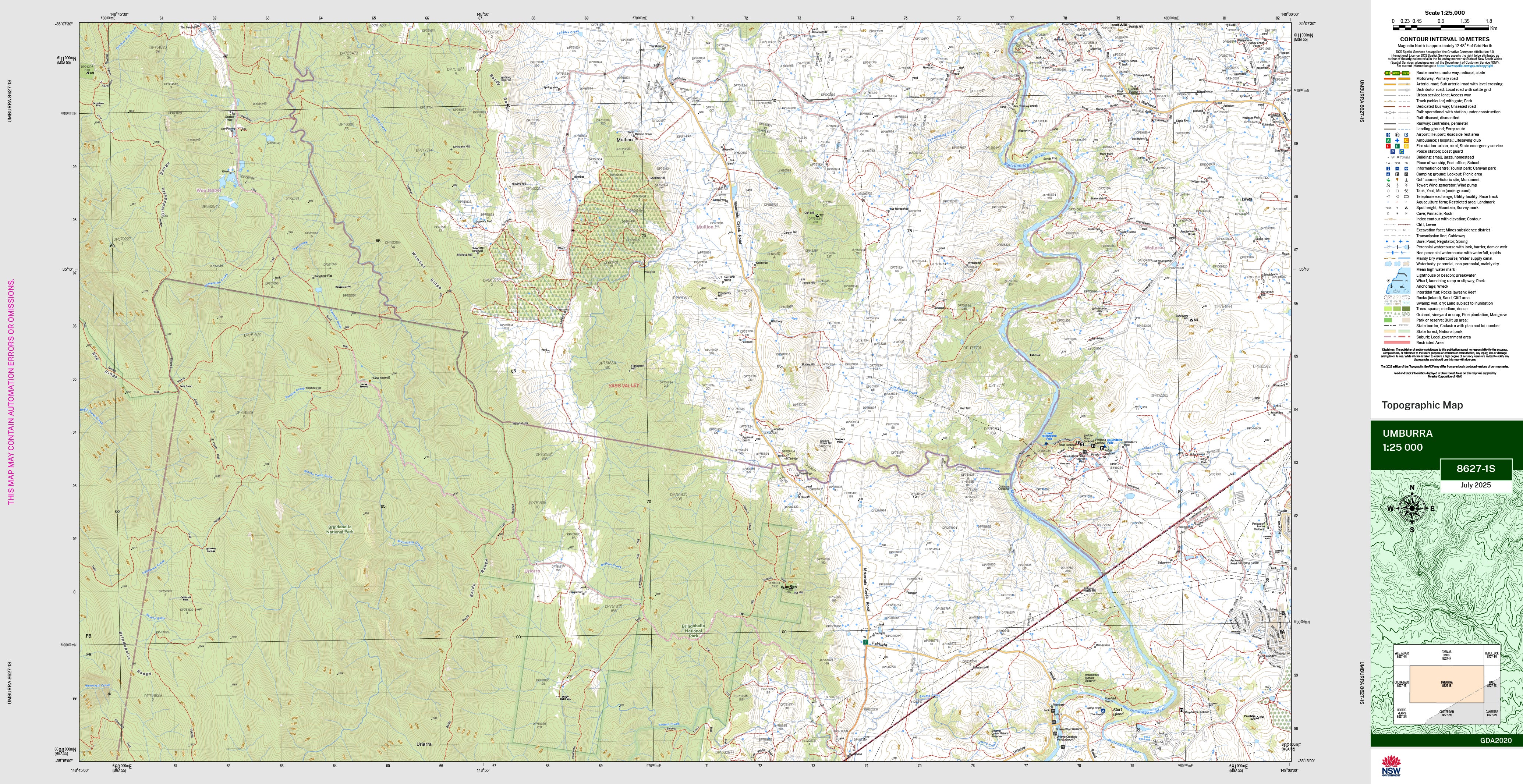 The Umburra 1:25,000 scale New South Wales topographic map shows contours, streams, roads, tracks, buildings, place names, points of interest, vegetation, selected administrative boundaries and much more.
