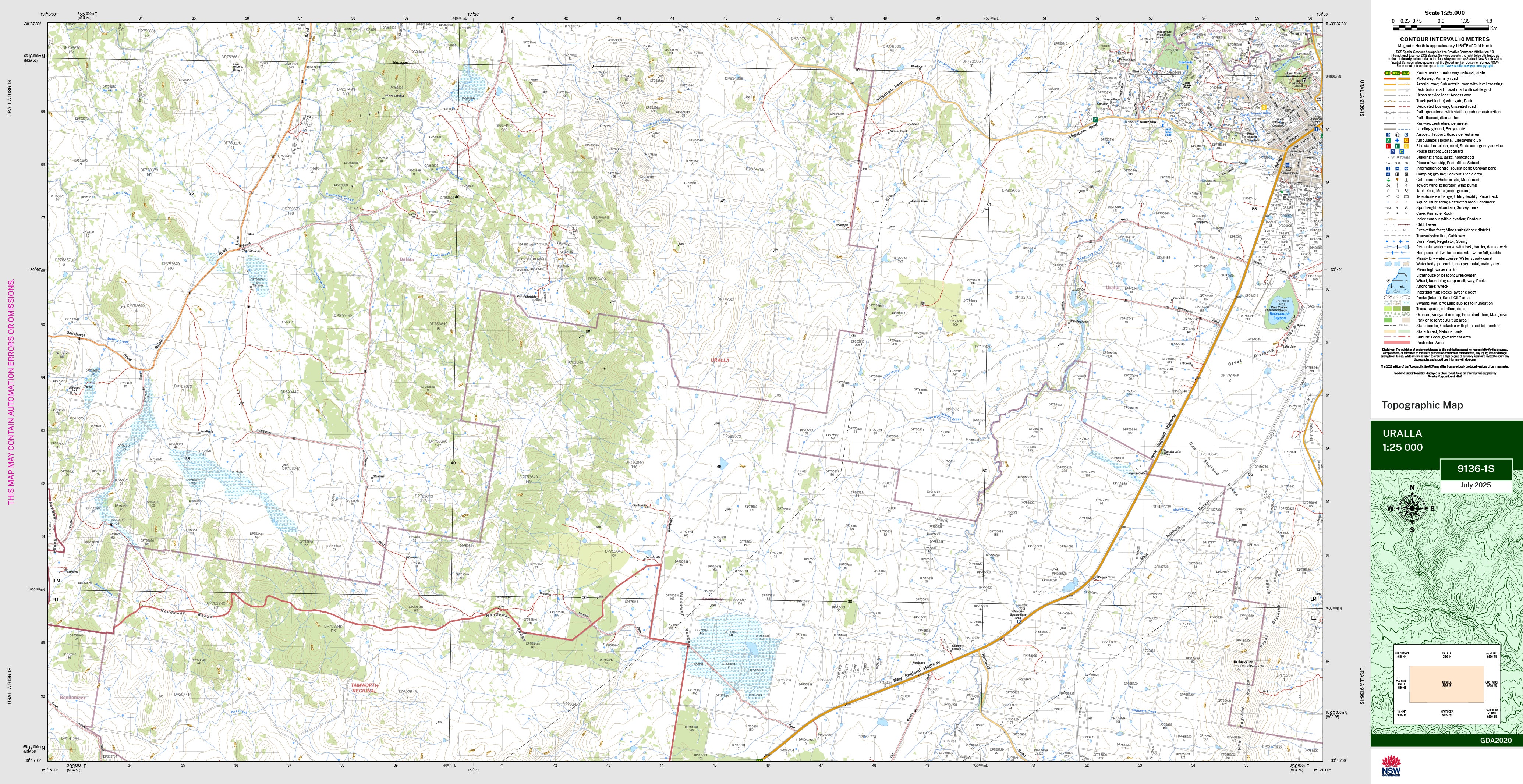 The Uralla 1:25,000 scale New South Wales topographic map displays contours, streams, roads, tracks, buildings, place names, points of interest, vegetation, selected administrative boundaries, and more.