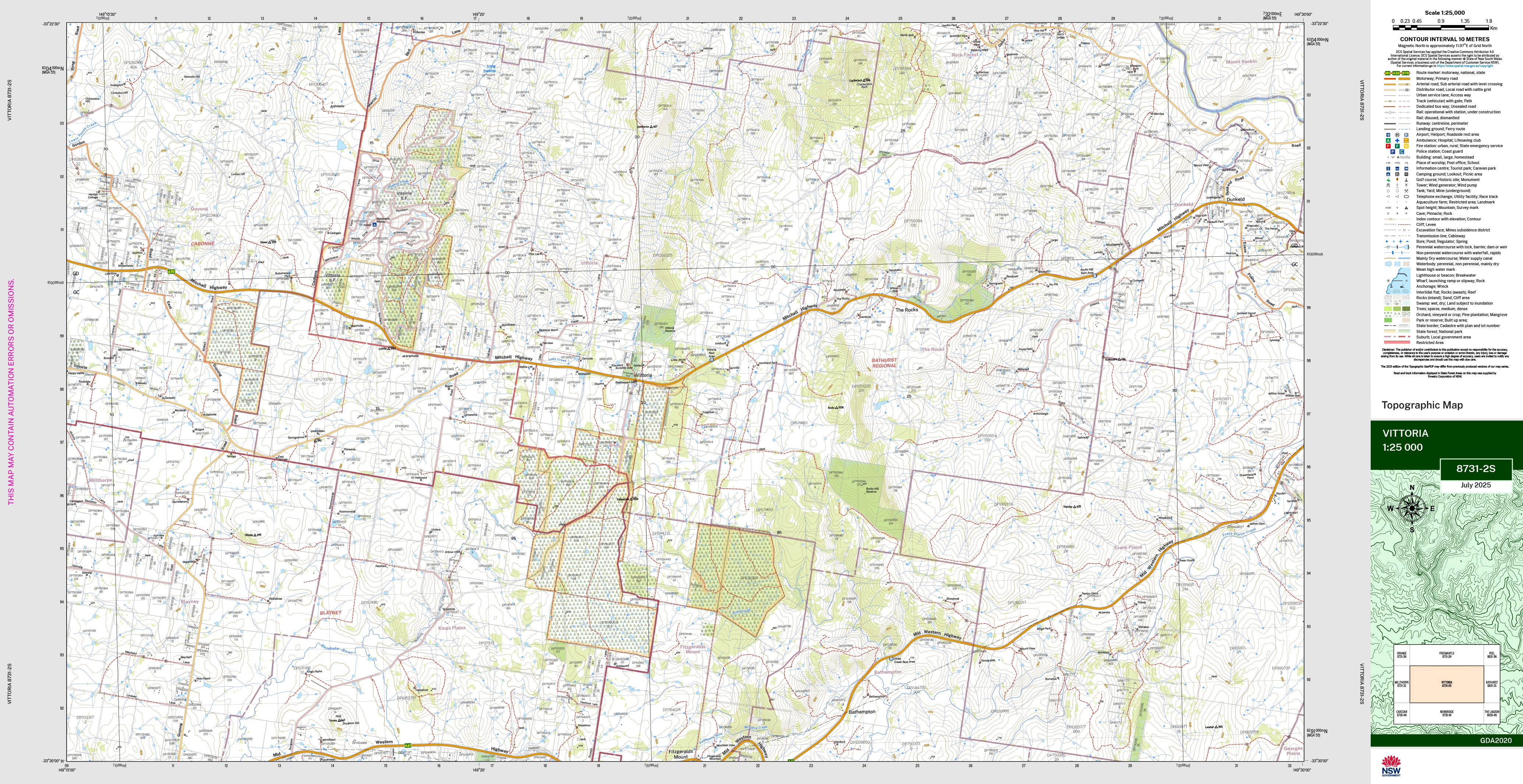 The Vittoria 1:25,000 scale New South Wales topographic map shows contours, streams, roads, tracks, buildings, place names, points of interest, vegetation, selected administrative boundaries and much more.